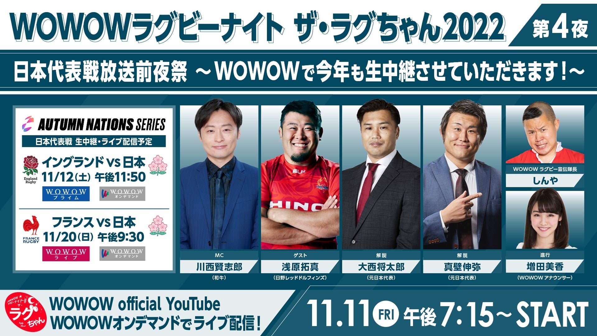 なおWOWOWでは日本代表戦をより深く楽しむための企画として、11月11日(金)午後7時15分から「WOWOWラグビーナイト ザ・ラグちゃん2022 第4夜 日本代表戦放送前夜祭~WOWOWで今年も生中継させていただきます!~」をWOWOWオフィシャルYouTube(https://youtu.be/Tv_PucfAQjU)と、WOWOWオンデマンド(https://wod.wowow.co.jp/content/118918)でライブ配信する。出演者は、和牛・川西賢志郎、元日本代表の大西将太郎、真壁伸弥、しんや、ゲストとして元日本代表の浅原拓真が登場。番組では日本、イングランド両チームのスターティングメンバー発表を受けての試合展望や、注目選手などを分析。特派員記者によるロンドンからの現地直前情報などもお届けする。