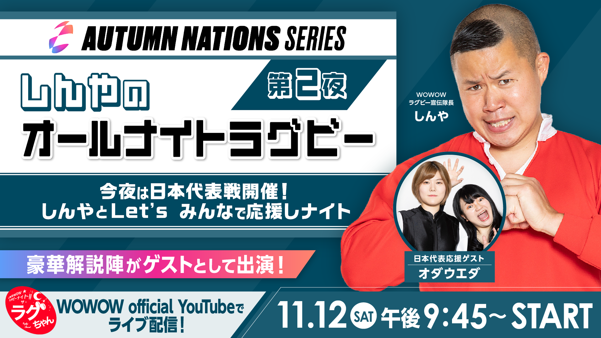 WOWOWラグビー宣伝隊長・しんや初の冠番組「しんやのオールナイトラグビー第2夜 ~今夜は日本代表戦開催!しんやとLet’sみんなで応援しナイト~」も11月12日(土)午後9時45分から約9時間ぶっ通しでWOWOWオフィシャルYouTubeでライブ配信(https://youtu.be/QZ5u23-fUNE)。配信開始から日本代表戦の終了までは日本代表応援チャンネルとして展開。キックオフ前には中継の解説を担当する大西将太郎、田中史朗選手、松田力也選手らもゲスト出演し、試合直前の見どころや現地情報を紹介予定。さらに日本代表応援ゲストとしてオダウエダの出演が決定!日本代表戦終了後も、各試合の応援はもちろんのこと、中継の解説・実況メンバーとのラグビー談義や、ゲーム対決など面白企画が満載だ。