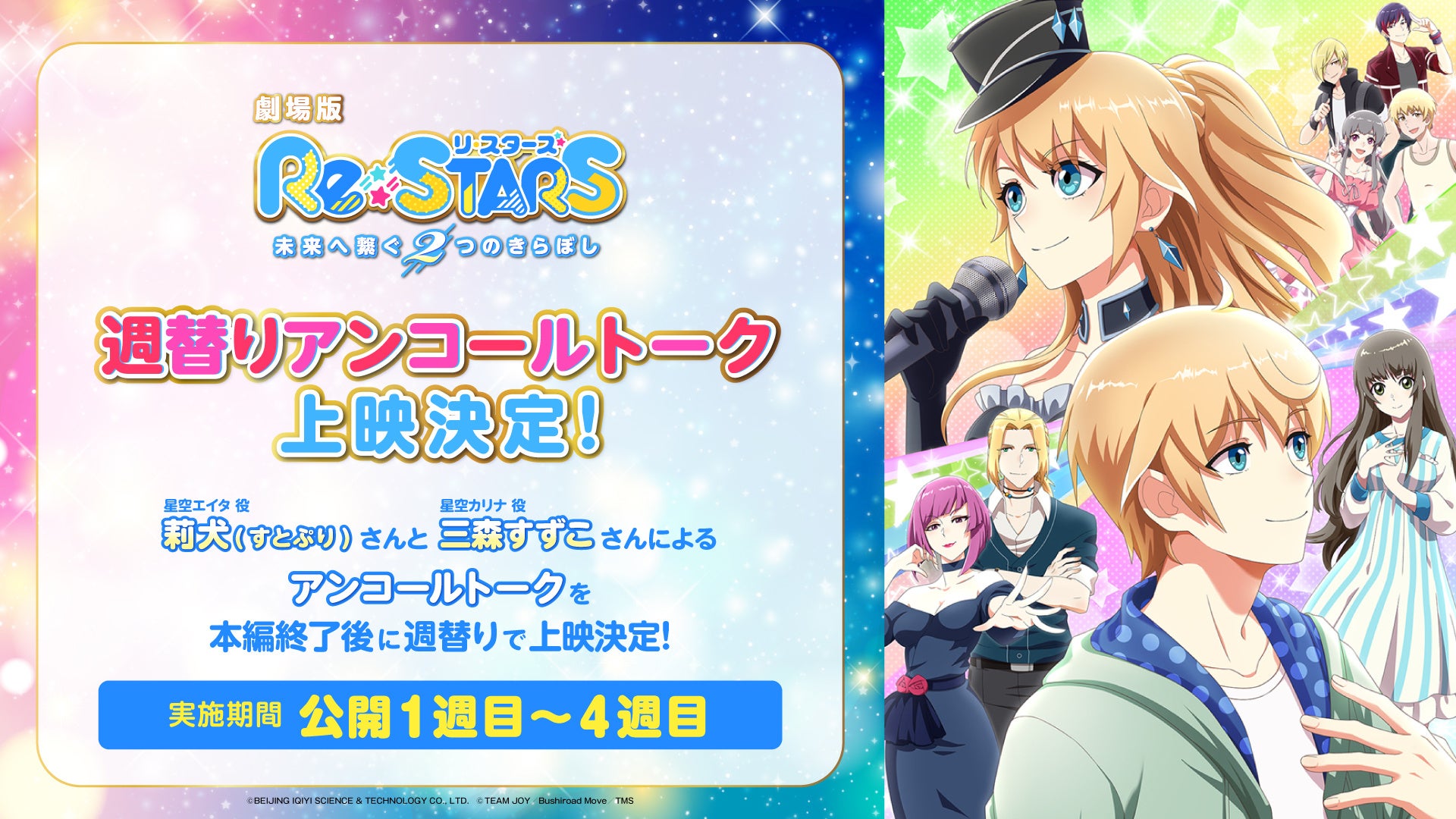 また本編終了後のエンドロールは週替わりで絵柄の変わる特別仕様!さらにエンドロール後には星空カリナ役の三森すずこさん&星空エイタ役の莉犬(すとぷり)さんによる週替わりアンコールトークを上映いたします!本編と合わせ、こちらもお楽しみに!