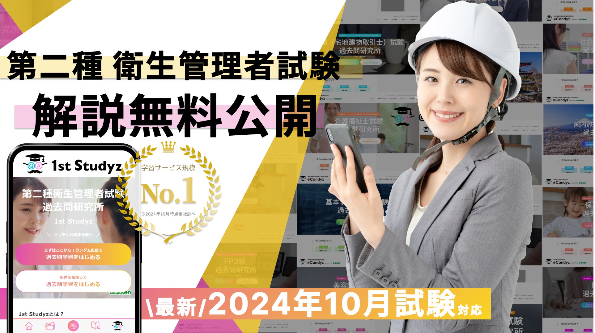 【17サービス7.7万問】が【すべて無料!】スキマ時間に学べる国内最大の資格学習プラットフォーム「1st Studyz」にて、「第二種衛生管理者試験」2024年10月公表分の問題と解説の公開を開始!