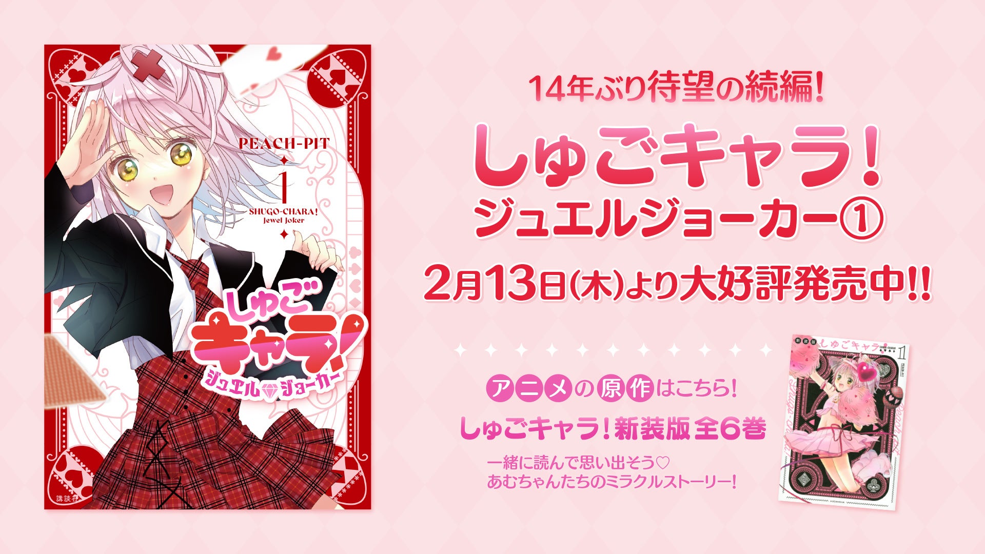アニメ化も舞台化も果たした人気マンガ『しゅごキャラ!』などで知られる、PEACH-PIT先生による待望の続編最新作『しゅごキャラ! ジュエルジョーカー』第1巻が本日2月13日より発売!これを記念して、講談社が運営するYouTubeチャンネル「フル☆アニメTV」にて、TVアニメ『しゅごキャラ!』1期1~5話を無料配信いたします。本日2月13日から4月25日までの期間限定配信となりますので、新作『しゅごキャラ! ジュエルジョーカー』と一緒にぜひお楽しみください!