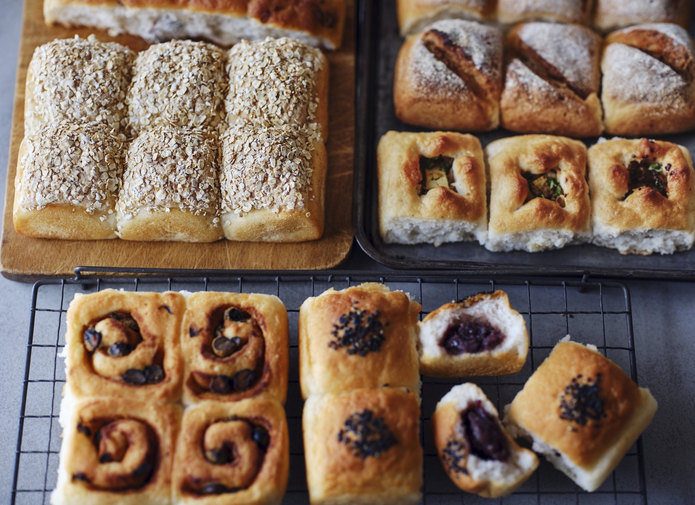 基本のプレーンちぎりパン/抹茶×プレーンパン/甘納豆パン/黒豆&きなこロール/キーマカレーパン/はちみつレモンパン/粒あんパン/さつまいも&ごまパン/かぼちゃロール/ハンバーガーバンズ/ドッグパン/ハムロール/焼き鳥パン/ジャーマンポテトパン/イングリッシュマフィン