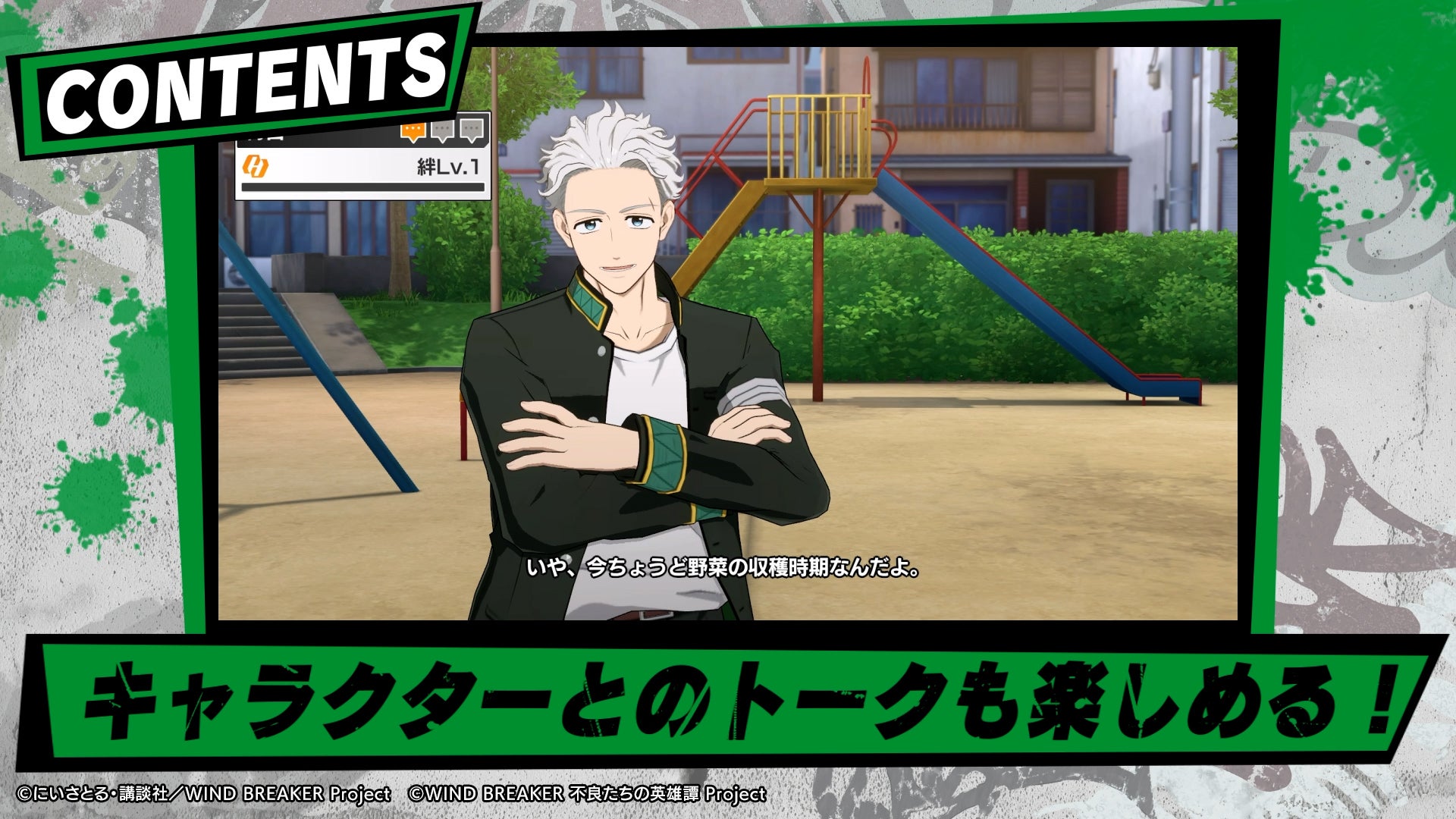 TVアニメ『WIND BREAKER』の世界をゲームならではの演出で表現した3DアニメーションRPGです。3Dグラフィック×アニメカットで描くTVアニメのストーリーや、兎耳山たち獅子頭連のオリジナルストーリー『獅子奮迅伝』をお楽しみいただけます。簡単操作で遊べるアニメティックバトルではお馴染みのキャラクターたちが登場。「必殺技」やロール次第で演出が変わる「タッグスキル」を駆使して戦闘に挑みましょう。他にも、キャラクターたちと様々な話題で絆を深めることができる「交流」や、3Dで再現された東風商店街の散策など遊べる要素は盛りだくさん。ボウフウリンや獅子頭連のメンバーたちと街を守りましょう!
