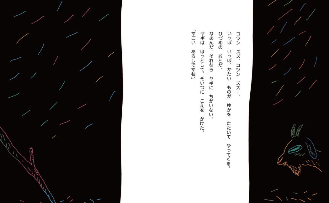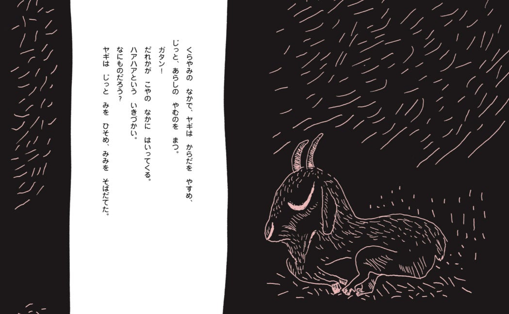 くらやみの なかで、ヤギは からだを やすめ、