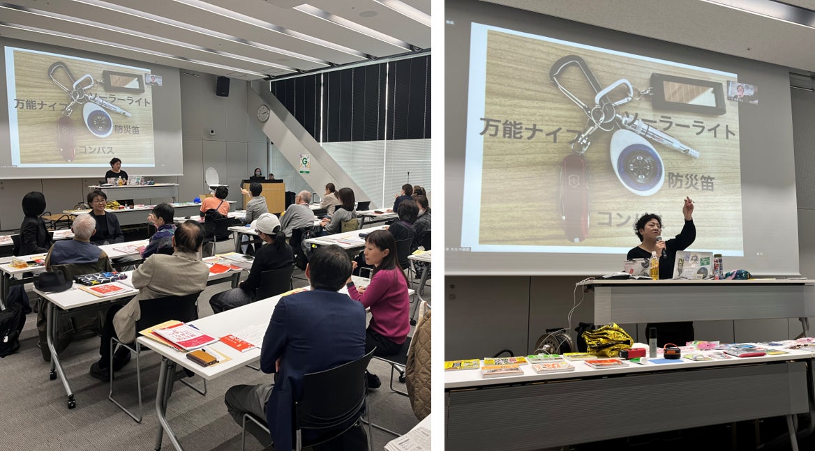 講師の辻直美先生からは、「防災のイロハ」として、減災や早期復興、快適な避難生活を送るための防災の意義について解説がありました。防災ボトルや防災ポーチ、ポータブル電源、災害トイレ、防災リュックなどの防災グッズに加え、転倒防止板や滑り止めシートといった家庭でできる防災テクニックも紹介されました。また、能登半島の事例をもとに、口腔ケアや排泄対策が誤嚥性肺炎など被災後の健康維持にも重要と説明がありました。防災は特別な準備ではなく、日常生活に+αとして取り入れることで普段の生活の質も向上することが強調され、ペットボトルのキャップを使ったうがいの方法や、ペットボトルを利用したランタンの作り方、新聞紙を使った頭の守り方など、参加者は楽しみながら防災について学びました。講演最後には、対策グッズや減災の方法に沢山の質問が寄せられました。