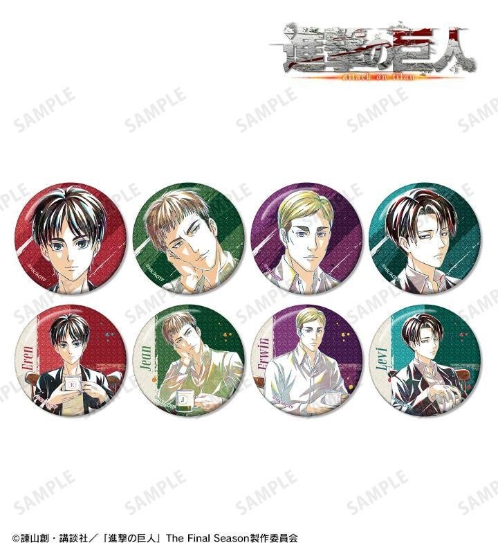 エレン、ジャン、エルヴィン、リヴァイの描き下ろしイラストを新たなタッチで魅力的に表現し、グリッター加工を施した缶バッジに仕上げました。