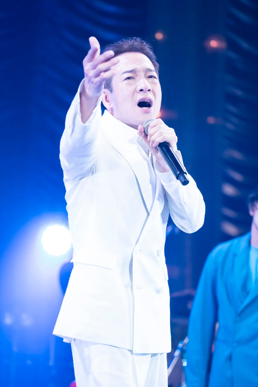 神秘的なSEに続き、黒い衣装に着替えて再登場すると、「22夏アルバムメドレー」に突入。「ザ・青春セイリング」が始まるとファンは手拍子でリズムを刻み、田原は大きく両手を広げ、たっぷりとしたマントのようなシルエットの衣装を翻し、力強いヴォーカルを響かせる。