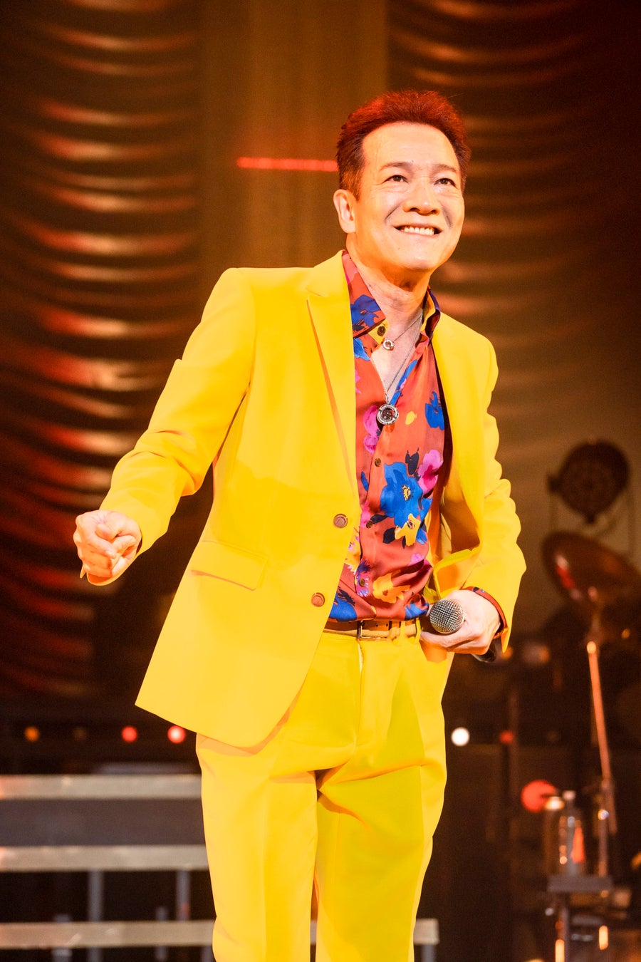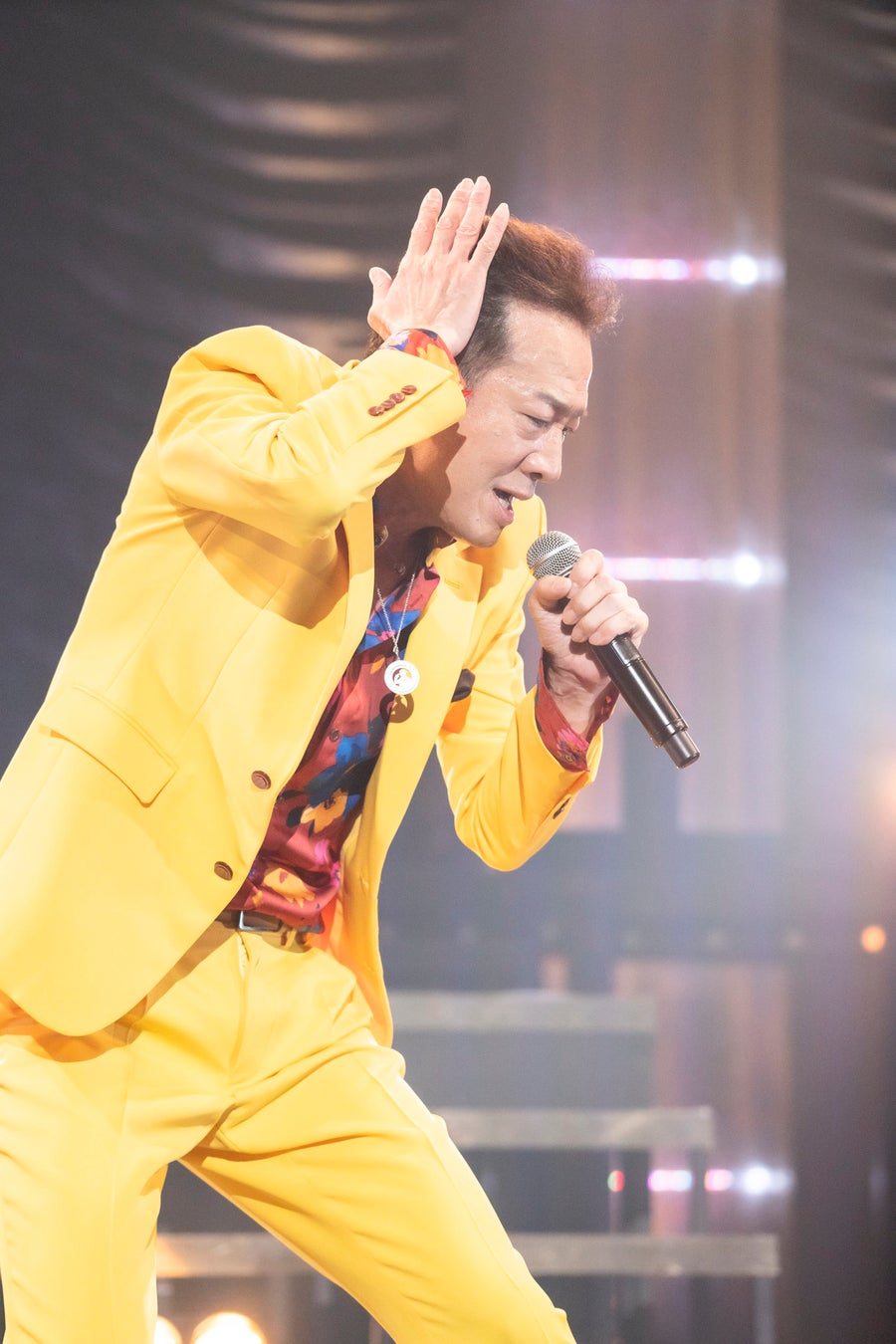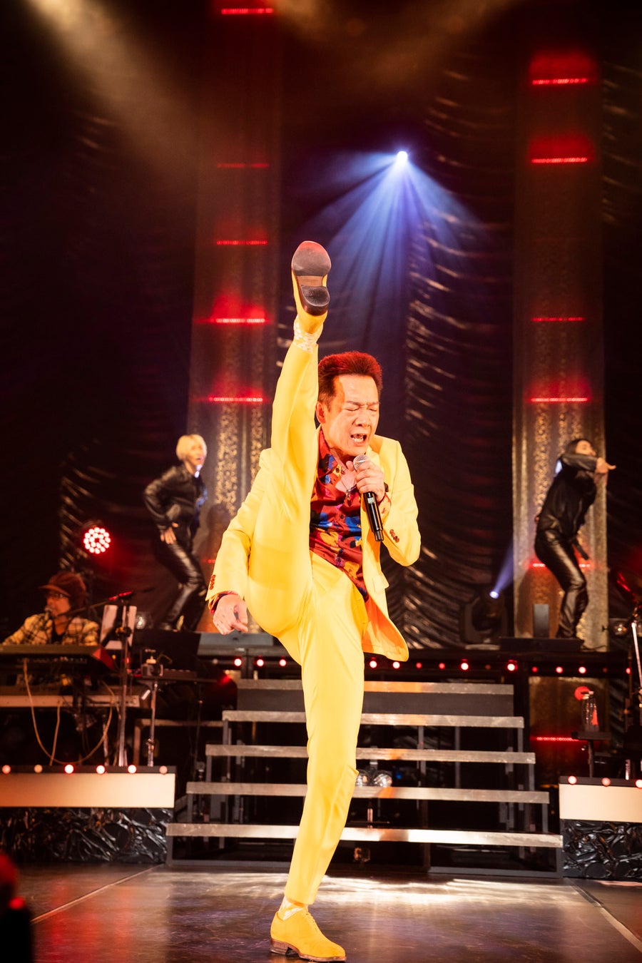 幕開けは1stアルバムの冒頭曲「スーパー・コミュニケーション」。実力者揃いのバンドメンバーが各自の技を発揮するソロ回しの後、全員揃ってのセッションが最高潮を迎えた瞬間、ステージ上の階段最上段に姿を現わした田原。全身黄色の衣装に身を包み、キレのある動きを見せながら歌い踊っていく。階段を下りながらダイナミックなパフォーマンスを見せる「原宿キッス」を1曲目とする「22夏シングルメドレー」は、あまりに豪華な選曲。2曲目「グッドラックLOVE」では哀切を湛えたメロディーを歌い上げ、3曲目「チャールストンにはまだ早い」からは男女2名ずつのダンサーが加わって華やかに群舞。10代当時を彷彿とさせる歌声で驚かせた4曲目「ハッとして!Good」、勢いのあるハイキック健在の5曲目、デビュー曲の「哀愁でいと」。コロナ禍による規制で歓声・シンガロングは禁止されている中、田原がマイクを客席に捧げると「トシちゃ~ん!」という、予め録音済みのファンの声が鳴り響く。デビュー以来毎年欠かすことなくライブ活動を行ない続けてきた、生粋のエンターテイナーらしい演出だった。