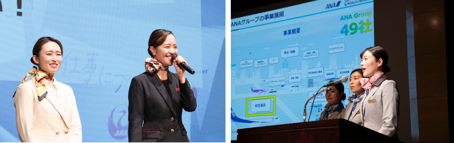 本セミナーは2027年度入社の新卒や既卒での採用を目指す就活生向けに、日本航空(JAL)と全日本空輸(ANA)の採用担当者、現役客室乗務員が登壇し、求める人材像や採用試験の内容などについて講演するものです。