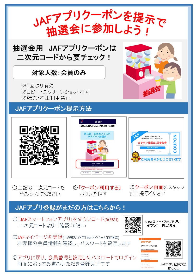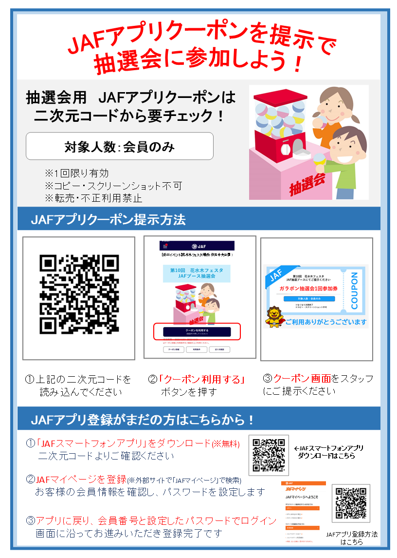 内容:JAFアプリクーポンを提示で抽選会に参加可能