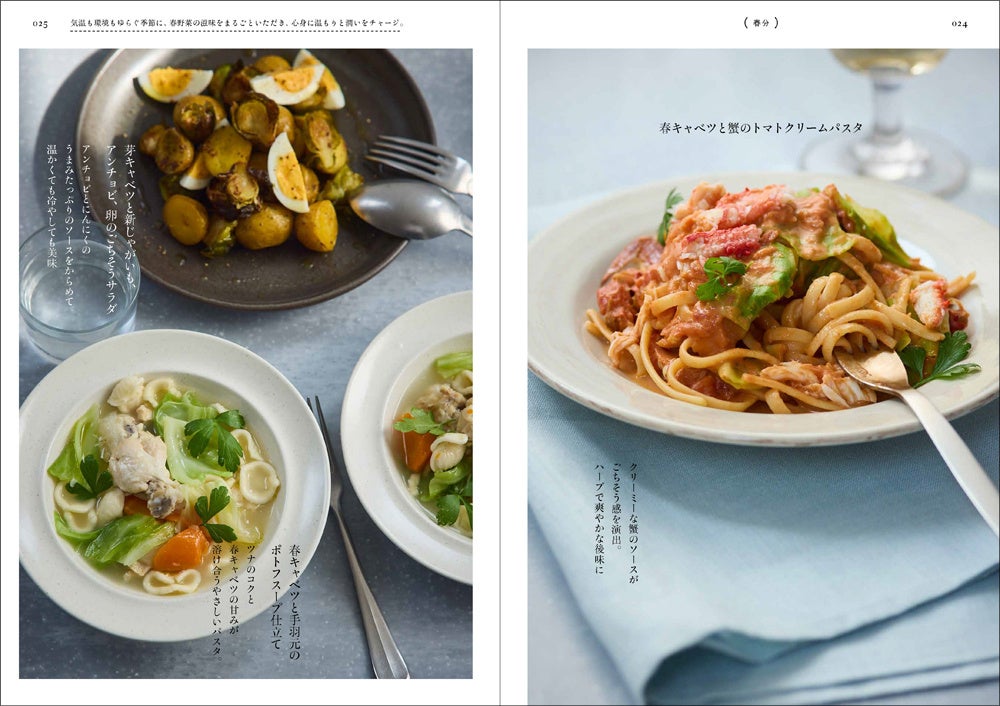 本書では「二十四節気」を軸に、季節ごとの体調の変化や養生のポイントをわかりやすく解説し、それに合わせた約60品のレシピを紹介。「疲れて元気が出ないとき」「乾燥や肌荒れが気になるとき」「気持ちが落ち着かないとき」など、日々の不調をやさしく整える一皿が揃っています。