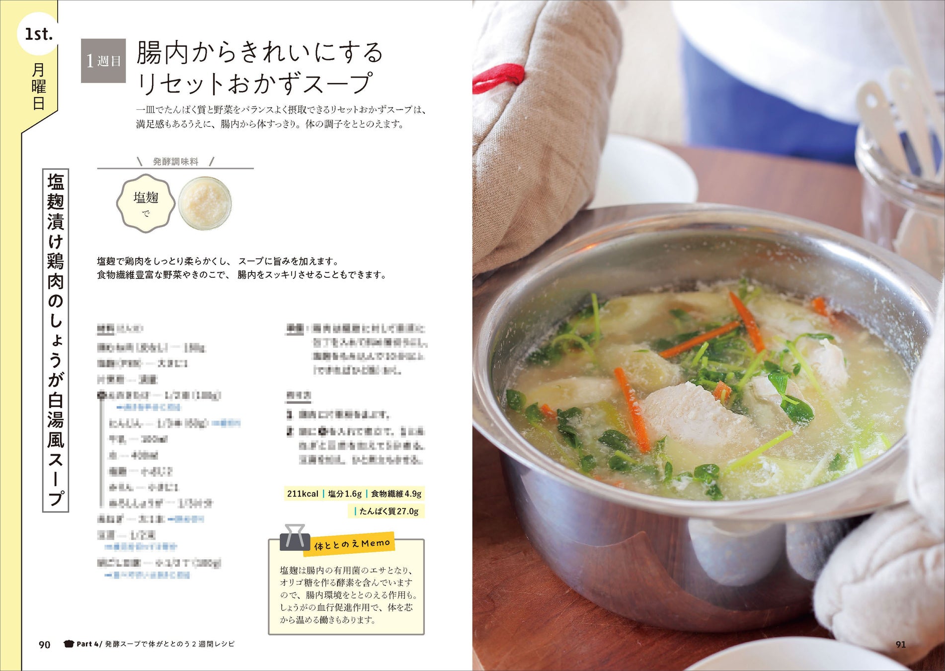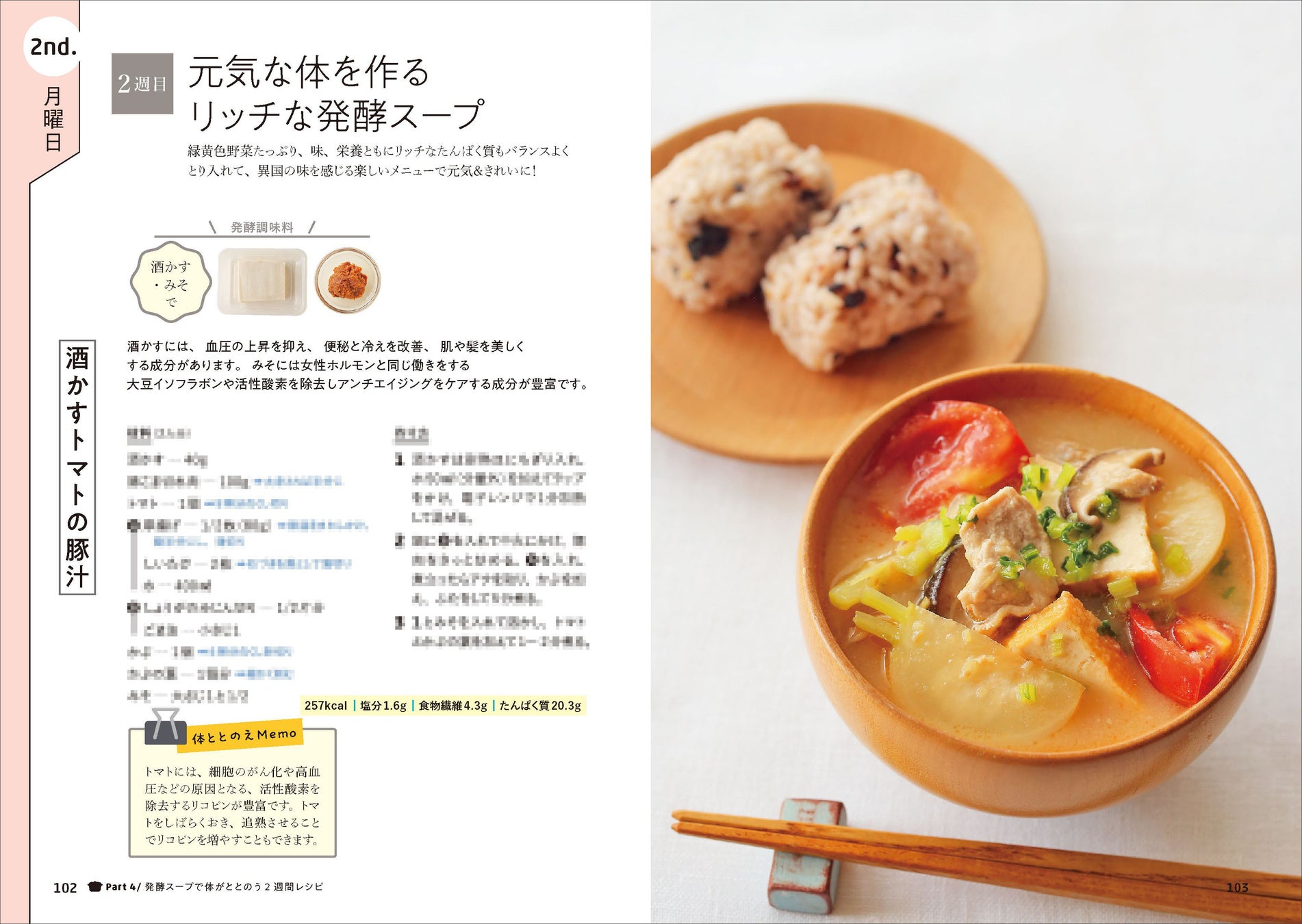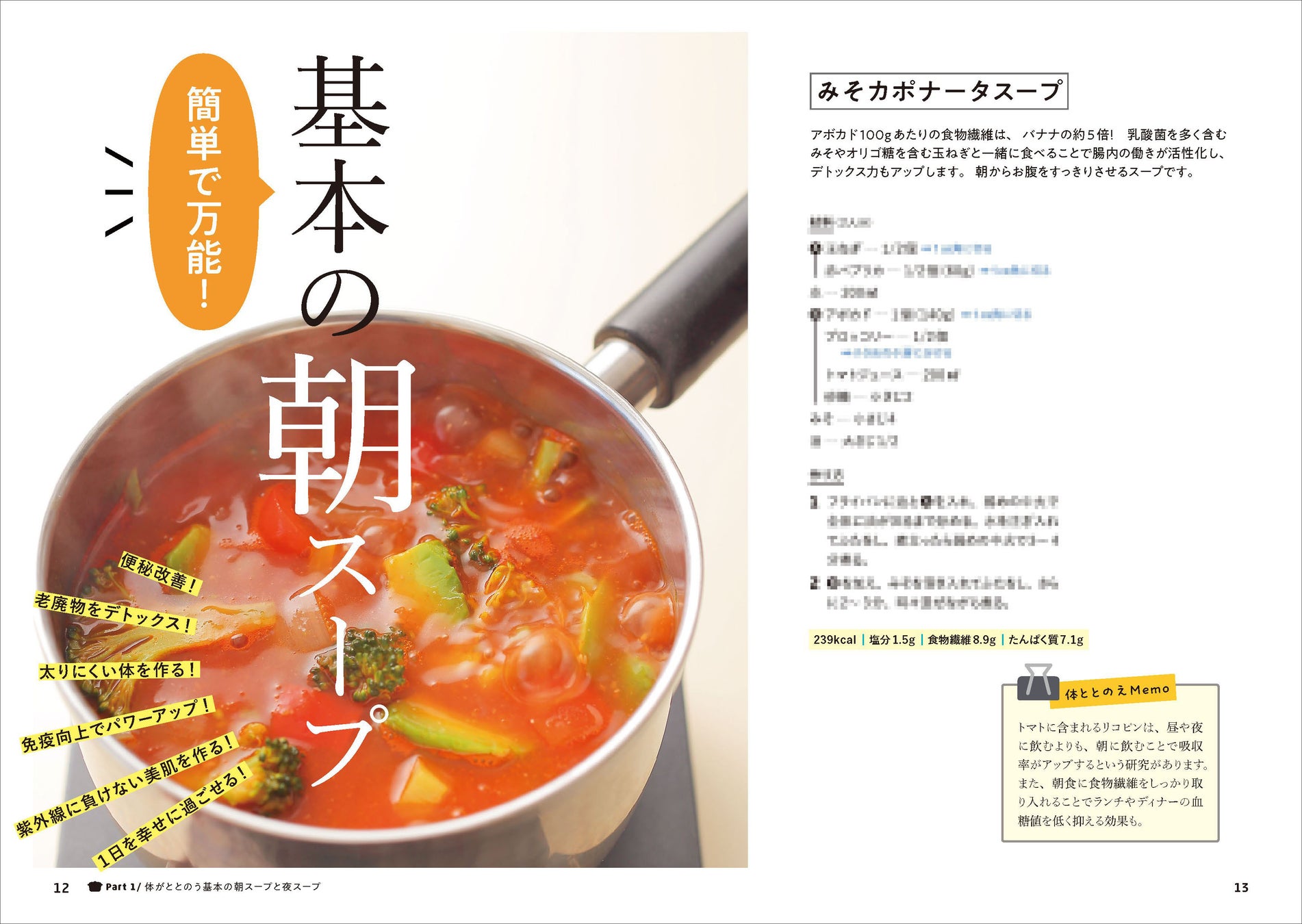 まず最初に試したい基本の朝スープ&夜スープ、野菜やきのこをメインに使った食材別のスープほか、便秘や冷えの改善、ダイエット、免疫アップなど、気になる不調の改善をサポートするスープもご紹介。さらに、塩麹やしょうゆ麹、酒かす、甘酒、みそなど、発酵食材をふんだんに使った発酵スープで体をととのえる2週間分のレシピなど、82の美腸レシピを掲載しています。
