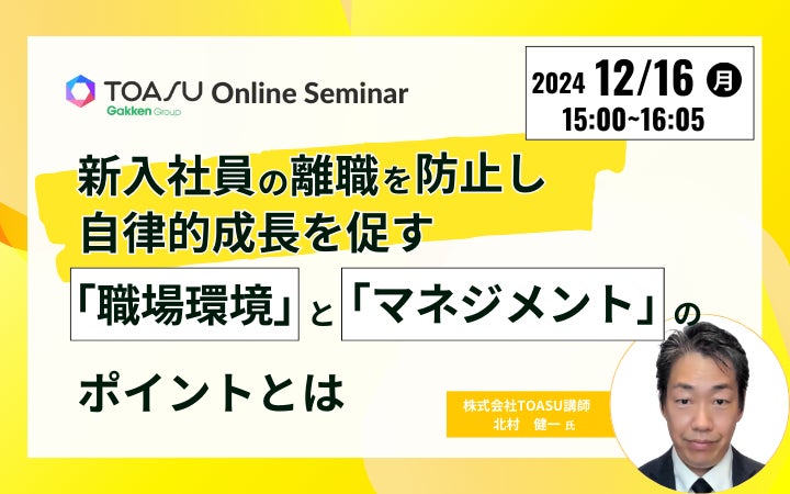 株式会社 学研ホールディングス(東京・品川/代表取締役社長:宮原博昭)のグループ会社、株式会社TOASU(東京・品川/代表取締役社長:宮田 晃)は、2024年12月16日(月)に、「新入社員の離職を防止し自律的成長を促す「職場環境」と「マネジメント」のポイントとは」セミナーを実施いたします。