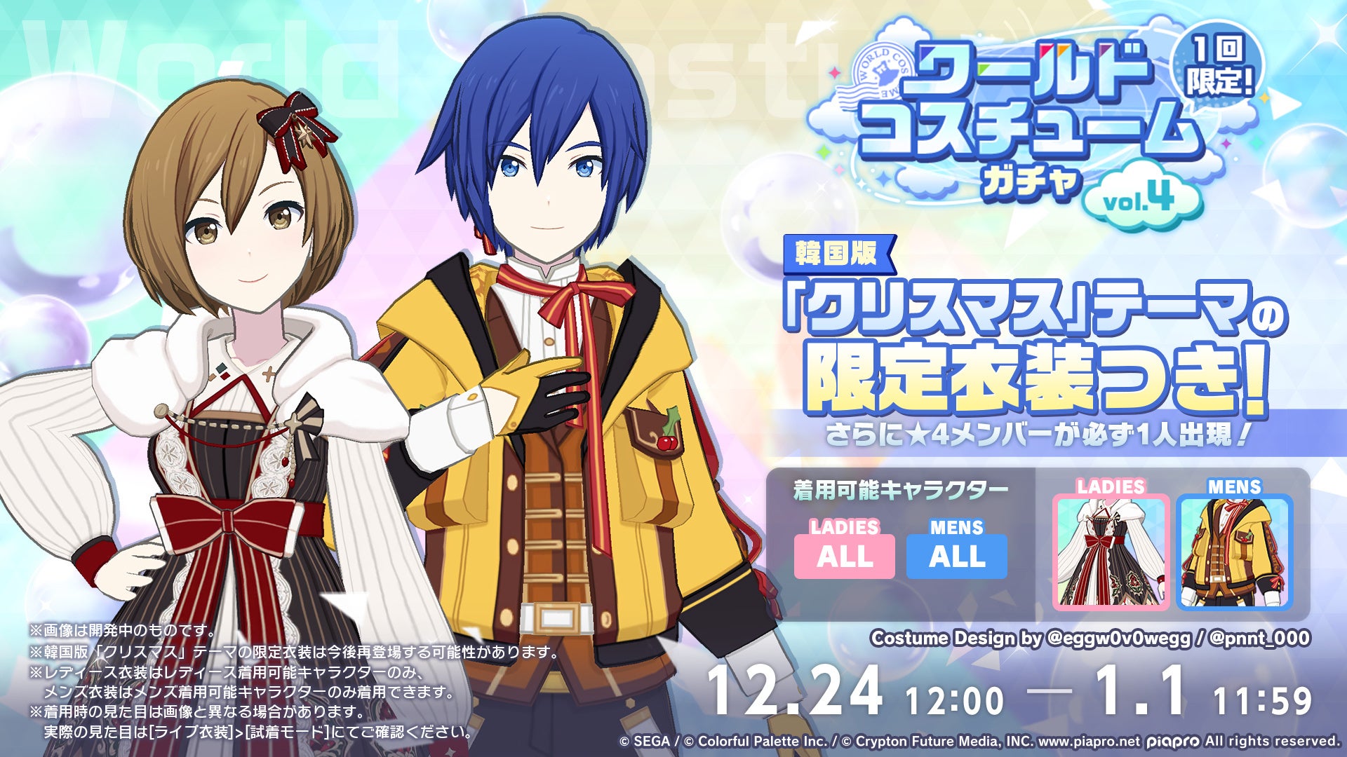ワールドコスチュームガチャの開催が決定いたしました。本ガチャでは、★4メンバーが必ず1人出現するほか、繁体字版「プロジェクトセカイ」からリリースされた「童話」テーマの限定衣装が付属するガチャと、韓国版「クリスマス」テーマの限定衣装が付属するガチャの計2種類を実施いたします。いずれもおひとり様一回限りで、有償クリスタル3,000個で引くことができます。