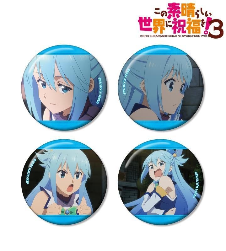 アクア、めぐみん、ダクネス、アイリスの印象的なシーンを缶バッジ4個セットに仕上げました。