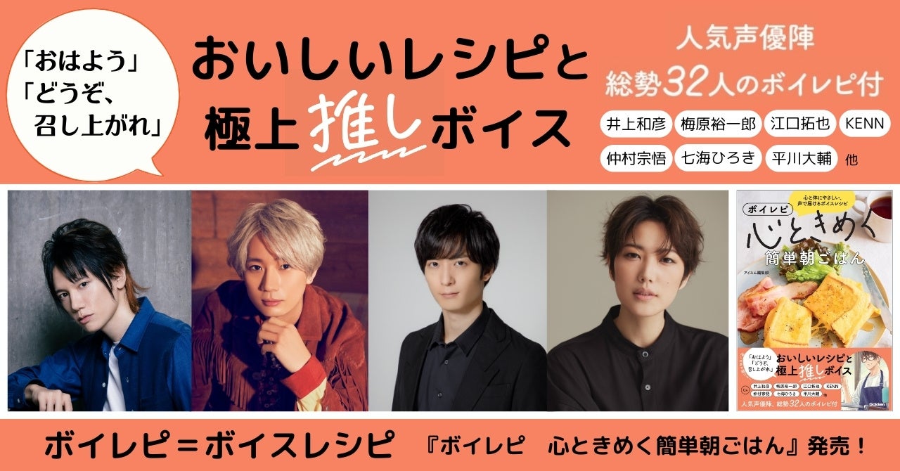 予約開始からランキング急上昇! 「おはよう」「どうぞ、召し上がれ」…江口拓也、梅原裕一郎など総勢32人の人気声優の癒しボイスで朝ごはんの気分が上がる、料理×音声のボイレピ本がついに発売!