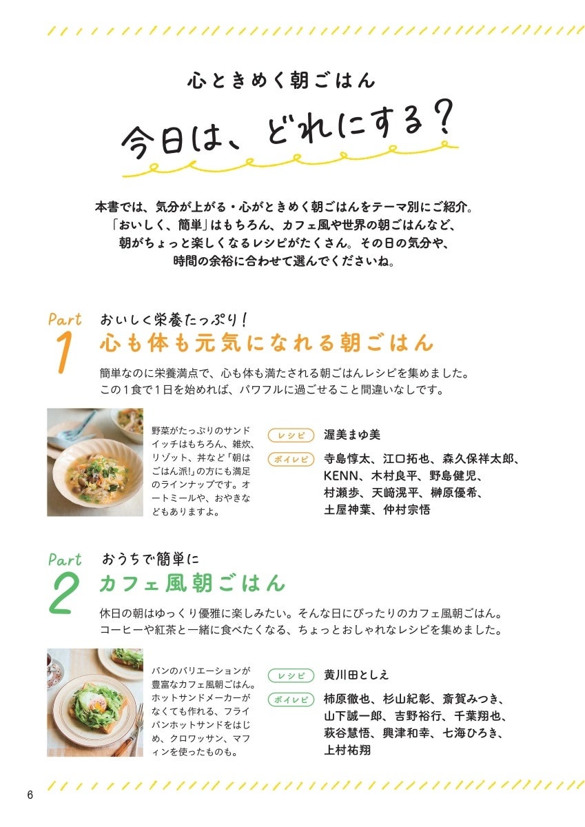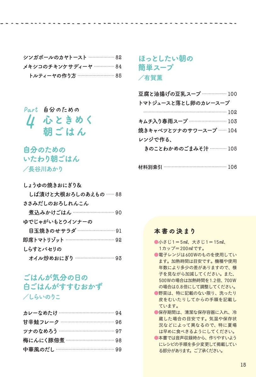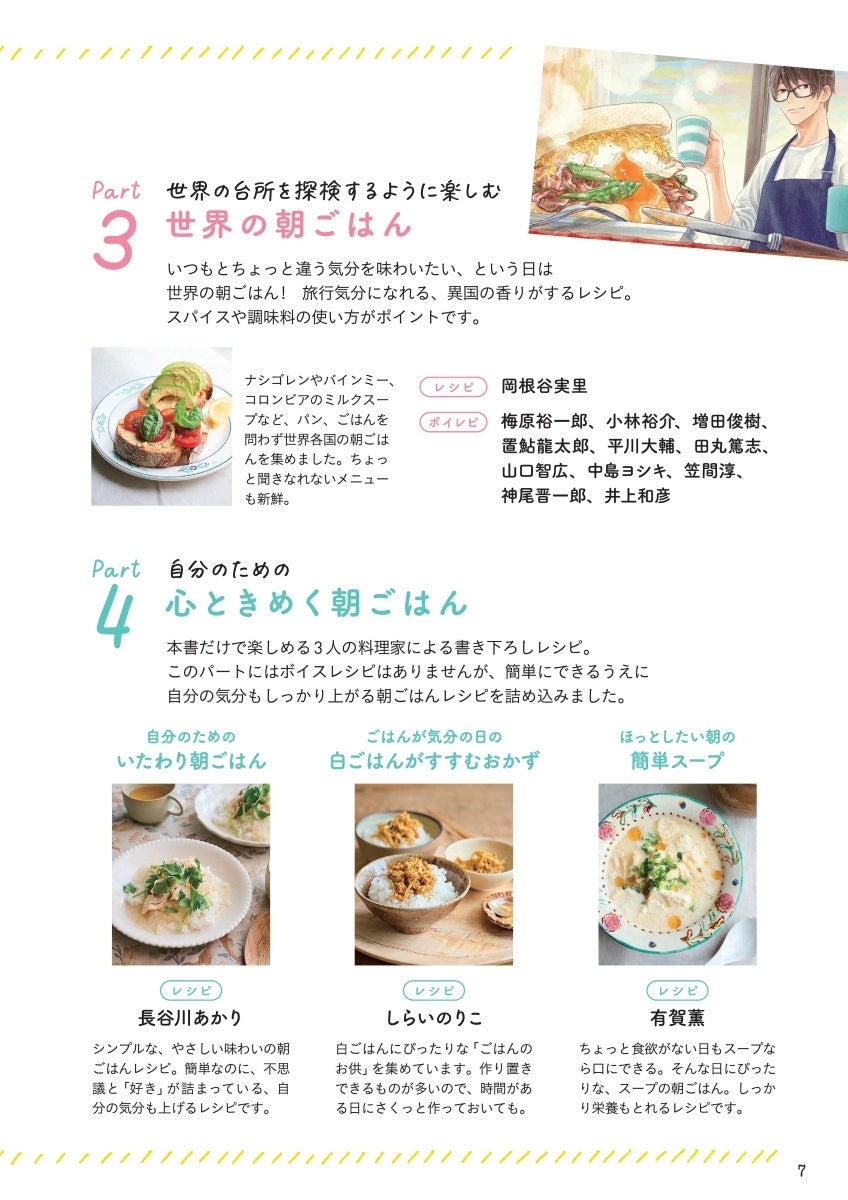 本書だけで楽しめる3人の料理家による書き下ろしレシピ。このパートには、ボイスレシピはありませんが、簡単にできるうえに自分の気分もしっかり上がる朝ごはんレシピを詰め込みました。