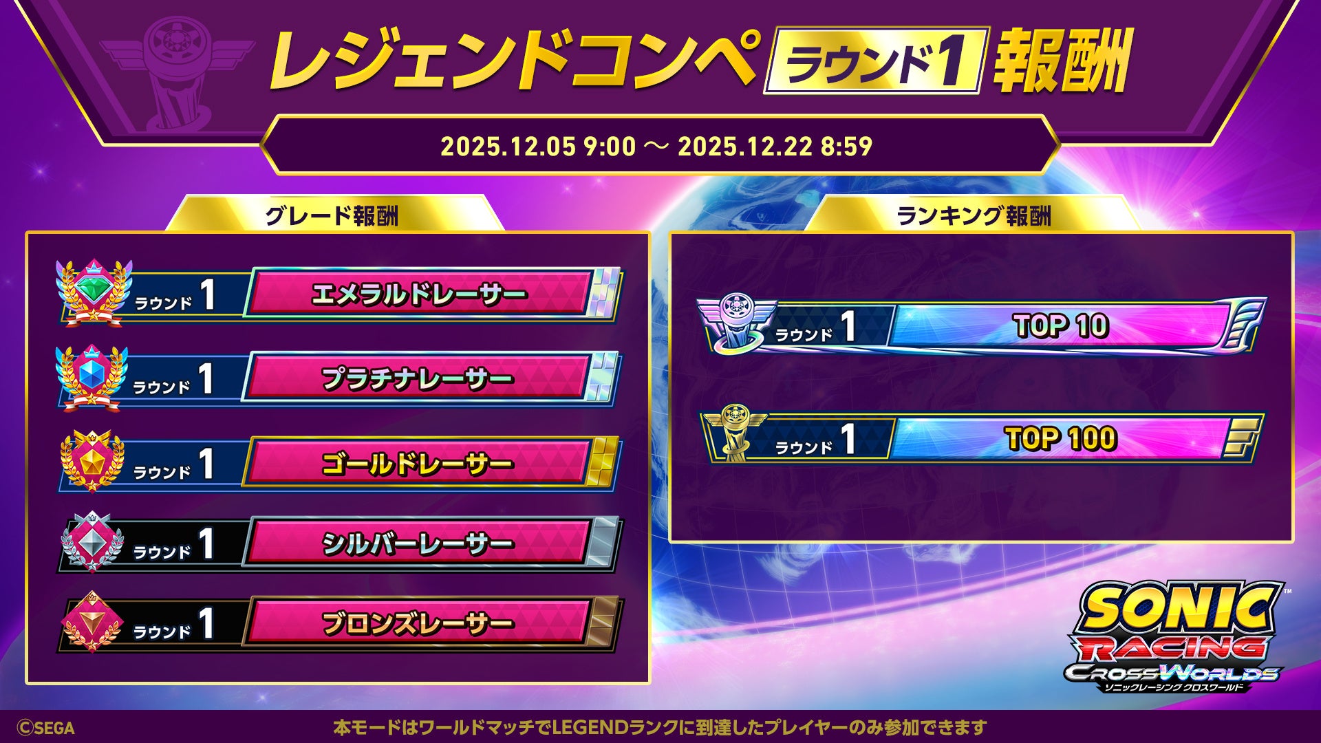 株式会社セガは、発売中の『ソニックレーシング クロスワールド』について、トップレーサーに向けた期間限定のゲーム内イベント「レジェンドコンペ」を2025年12月5日(金)より開催することを決定しました。