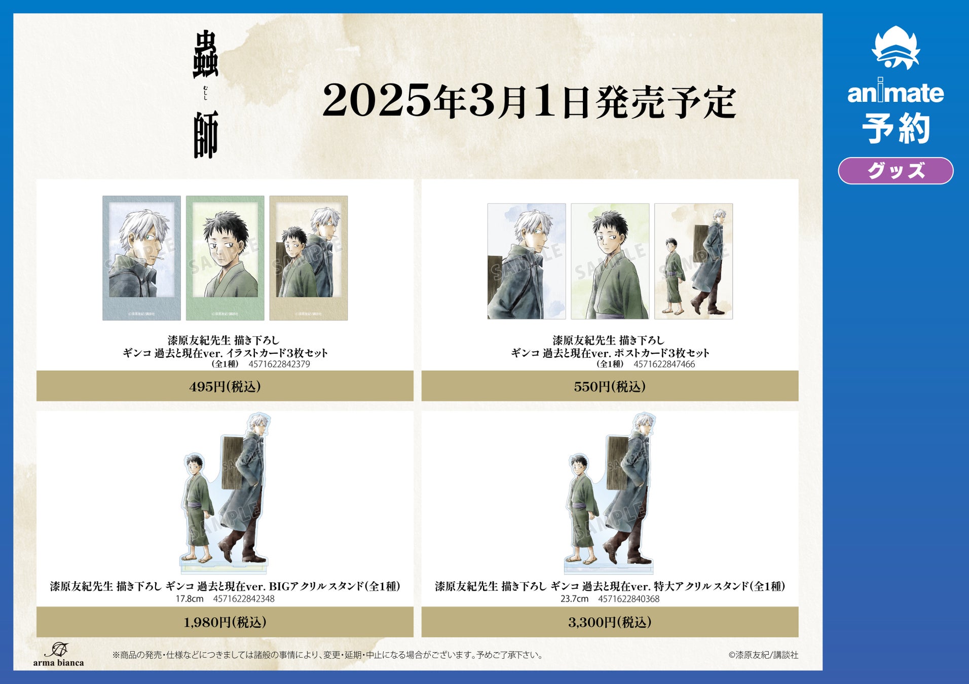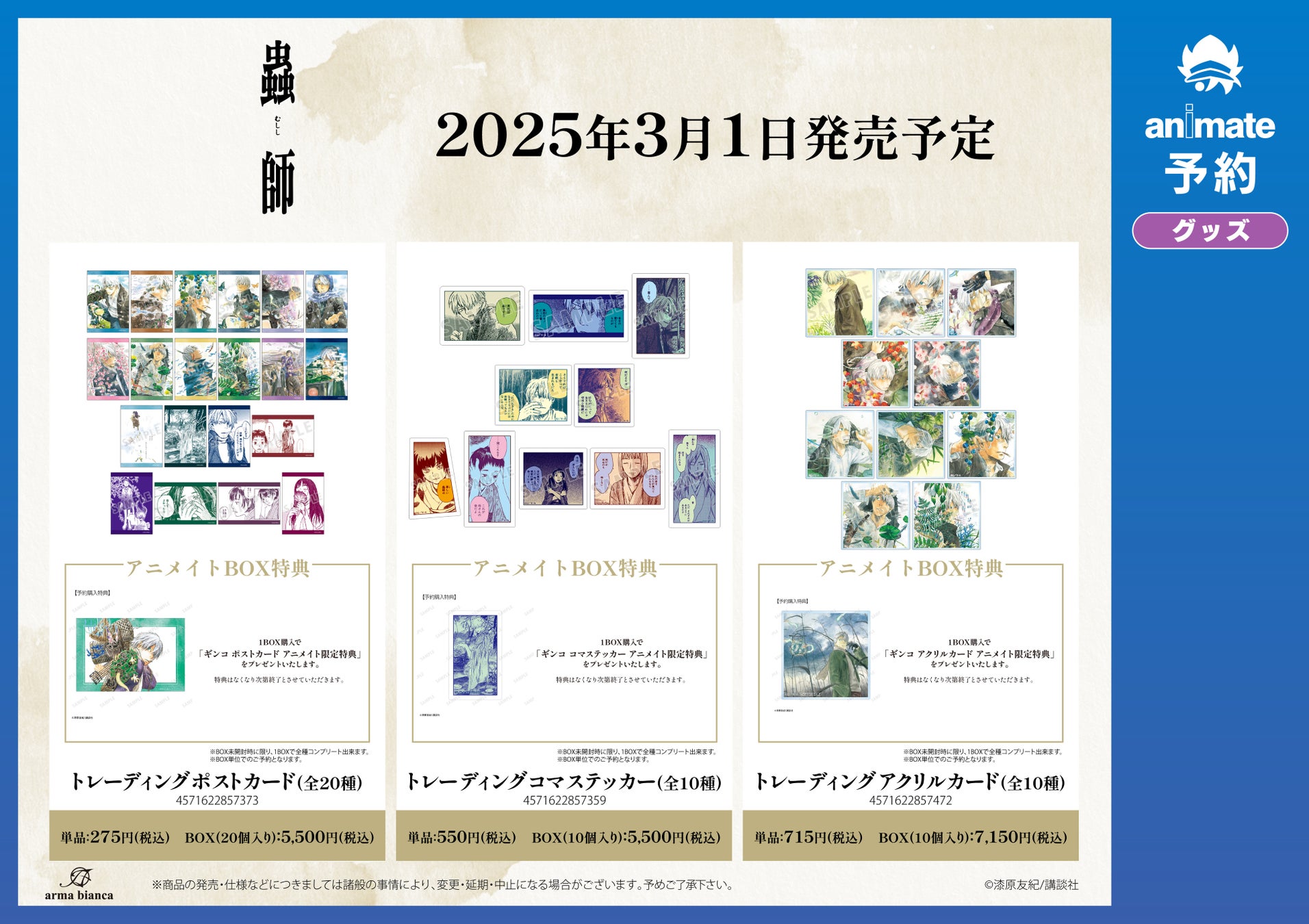 2024年12月19日(木)~2025年1月5日(日)の期間中、アニメイト通販にて『蟲師』の対象キャラクターグッズをご予約1,100円(税込)毎に、通販事前予約キャンペーン特典「ブロマイド(全6種)」を1枚プレゼント!