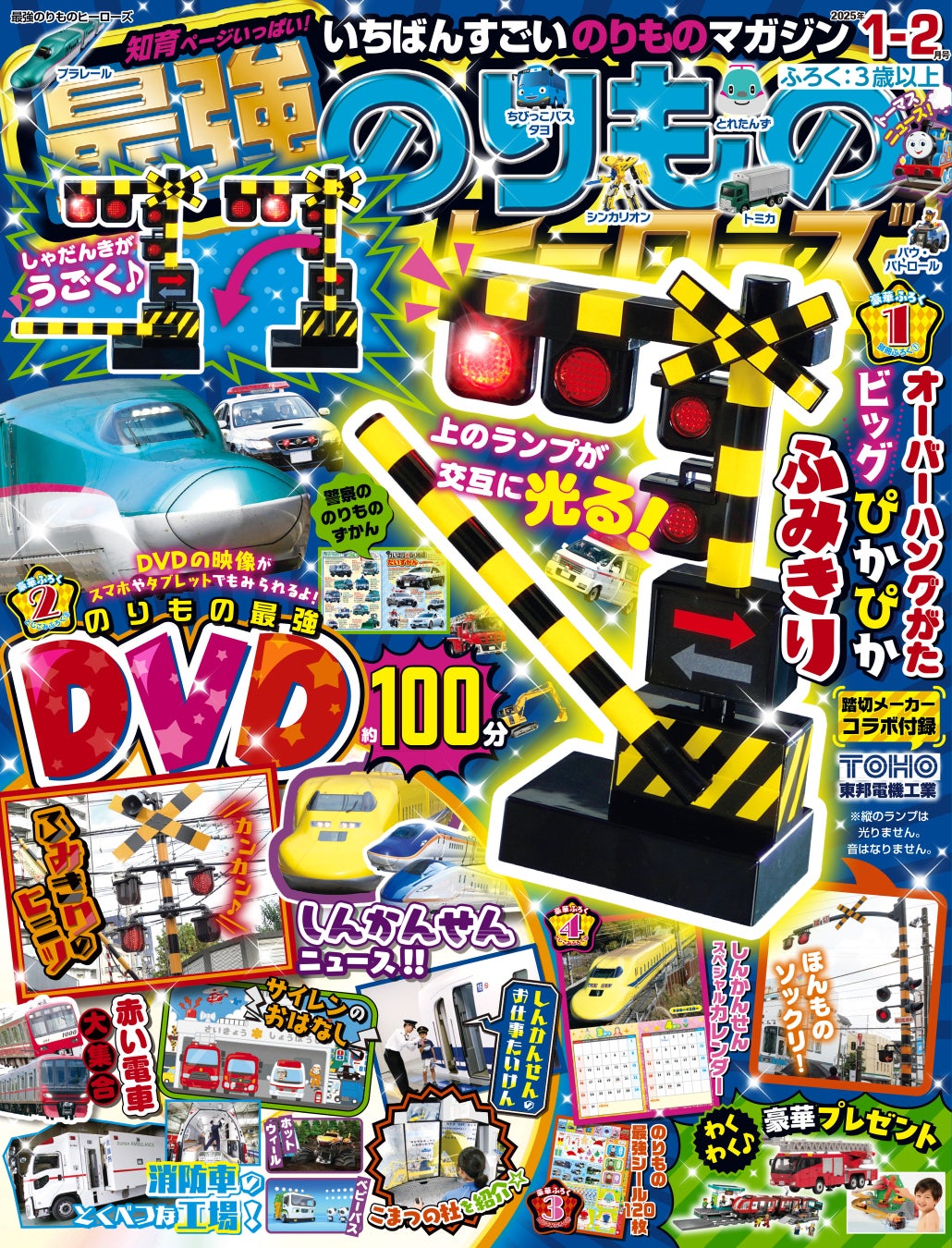 キッズ向けのりもの雑誌『最強のりものヒーローズ1-2月号』は、踏切大特集号! 豪華付録は踏切メーカーの東邦電機工業とコラボしたホンモノそっくりな踏切おもちゃ! スイッチを入れるとピカピカ光る♪ 珍しいオーバーハング型の踏切おもちゃです。DVDでも、踏切工場やいろんな形の踏切が登場! 踏切のカンカン音が楽しめます。ほかにも2024年に話題になった新幹線や、2025年の新幹線最新ニュース、消防車の整備工場などを大特集! 大迫力の新幹線スペシャルカレンダーや、のりものシールなど、盛りだくさんの1冊!!