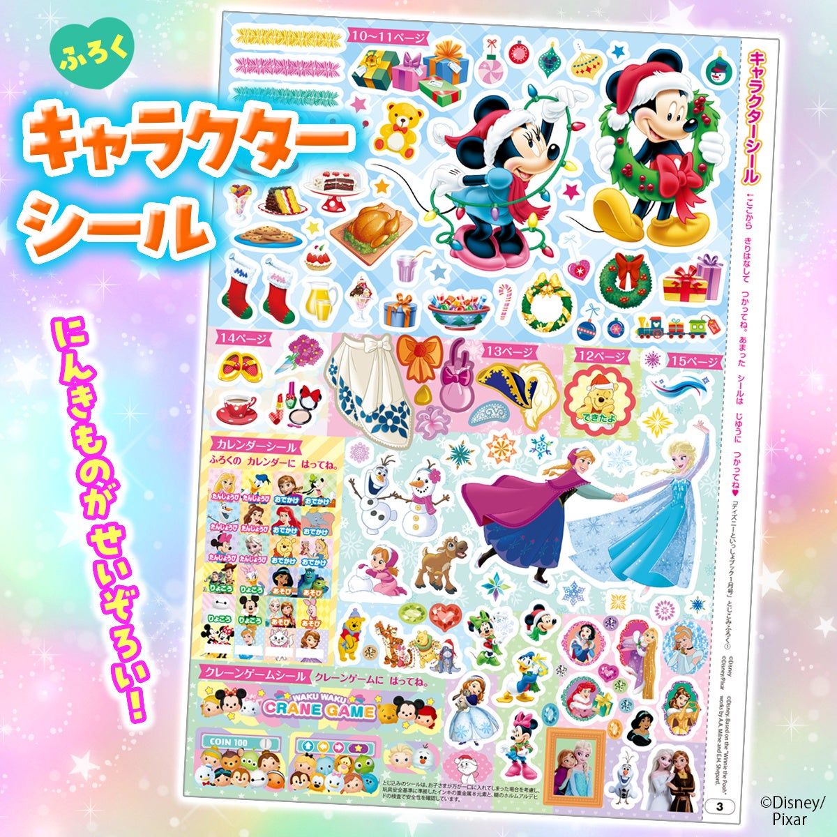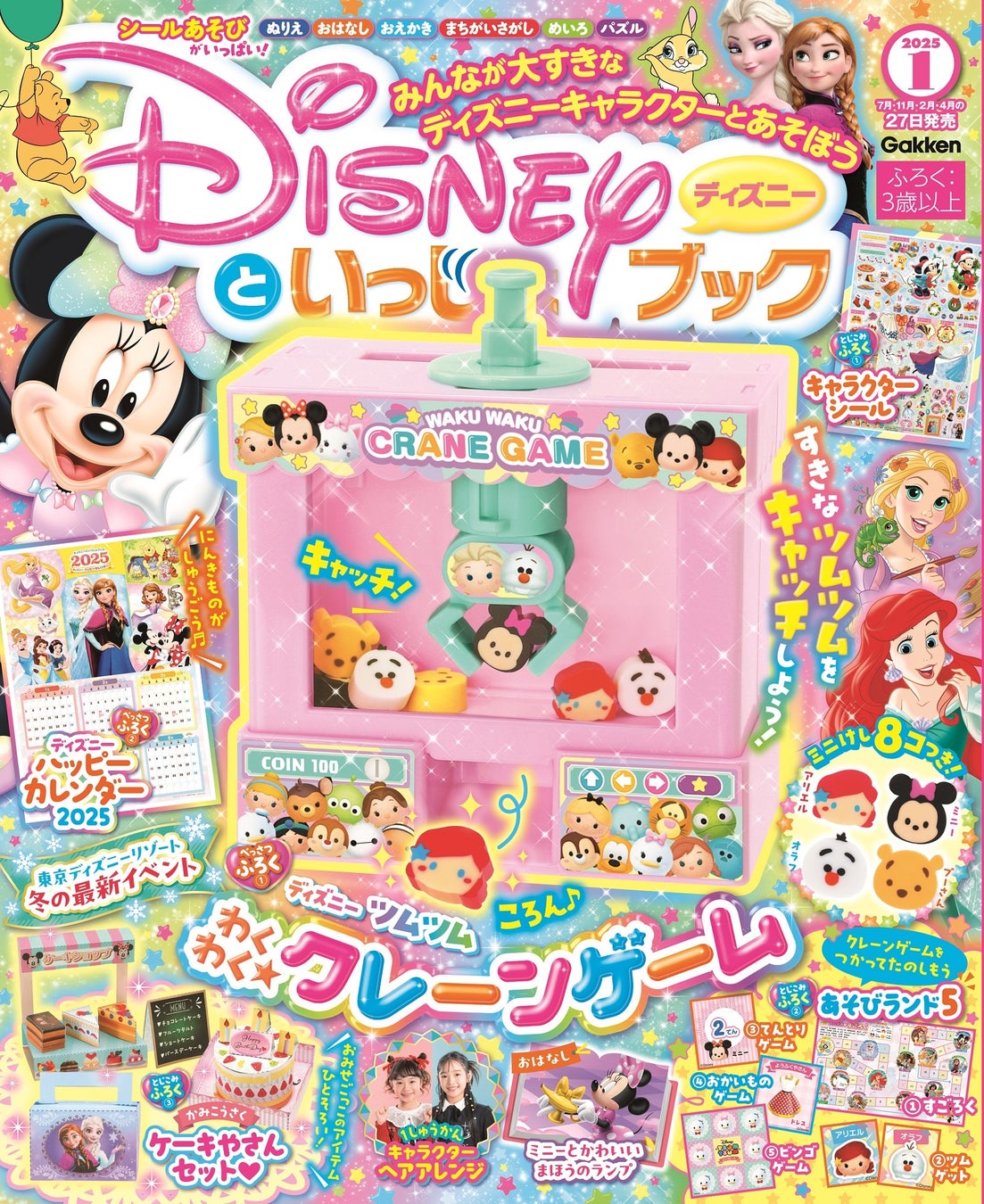 人気のディズニーキャラクターがいっぱいの5大ふろくは、クレーンゲーム、2025年カレンダー、キャラクターシール、ケーキやさんセット、ゲームセット! あそびページも満載の、1冊でたっぷり楽しめるブック。