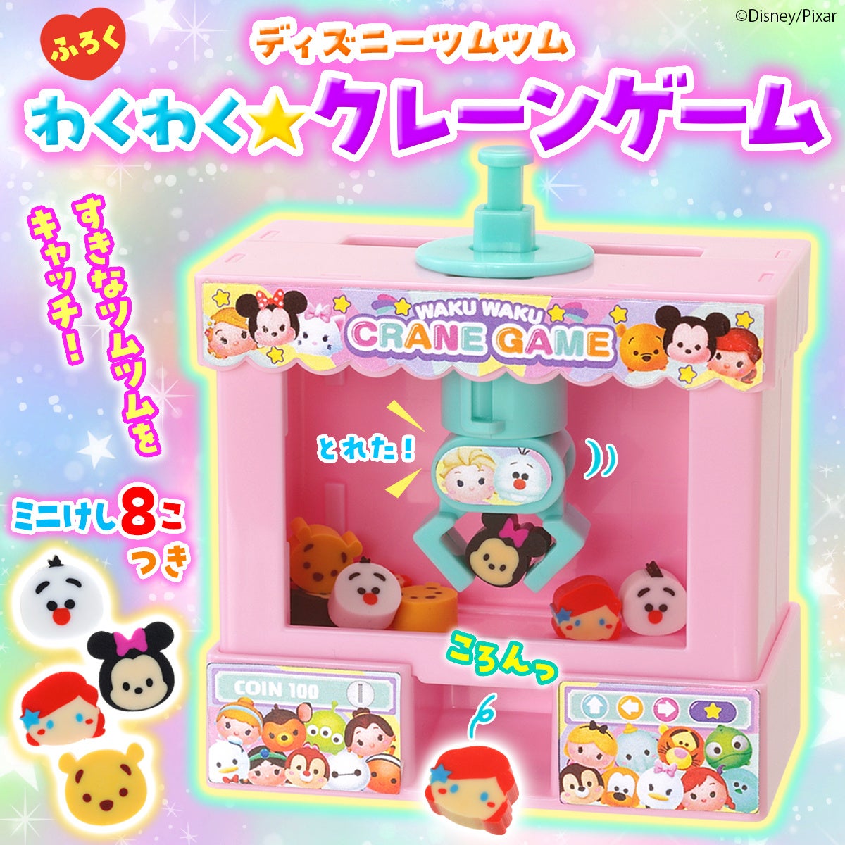 おうちでゲームセンター気分があじわえるクレーンゲーム! かわいいディズニーツムツムのミニけしが8個ついています。 クレーンを動かして、すきなツムツムのミニけしをキャッチ!