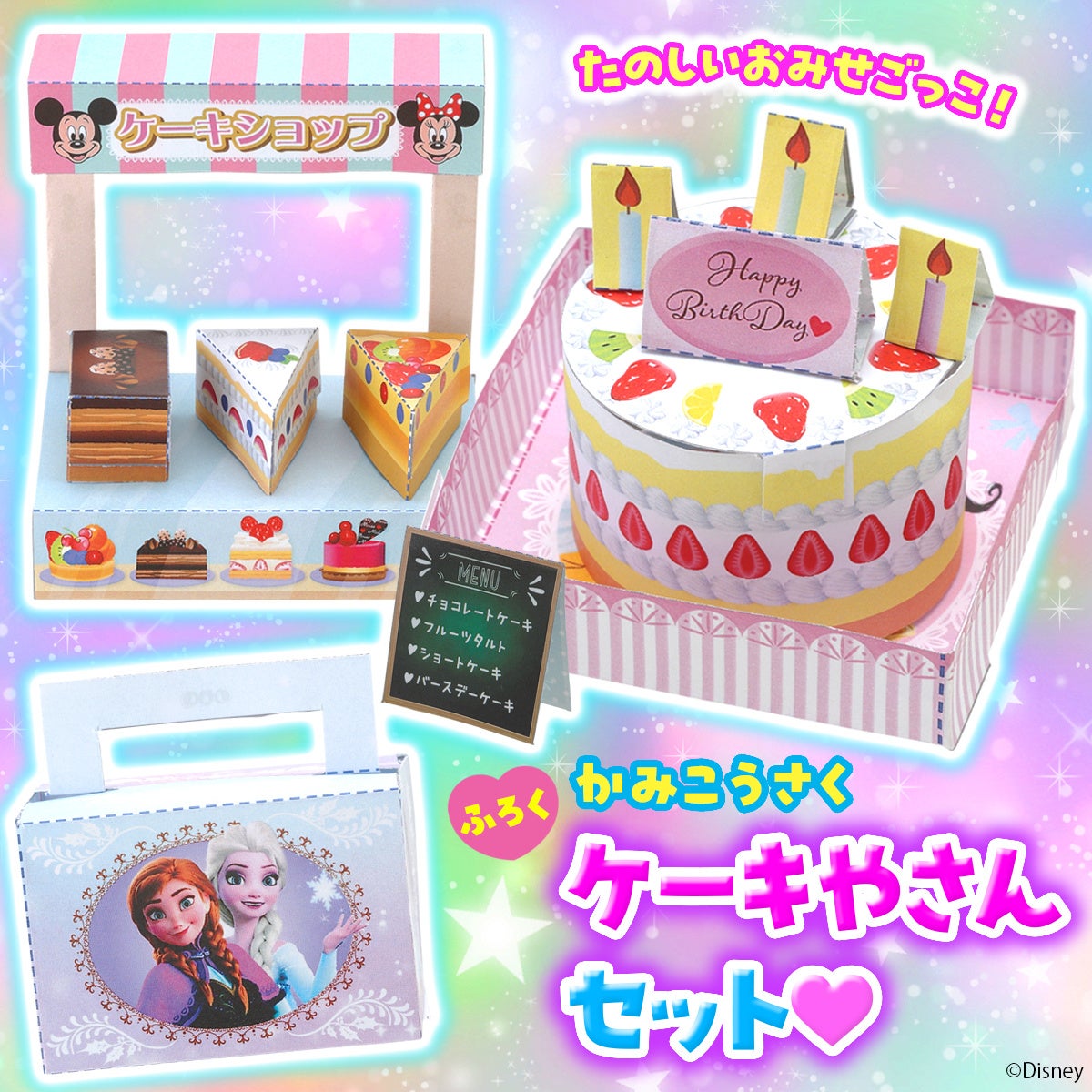 ケーキ、ろうそく&プレート、 トレイ、テイクアウト用のケーキバッグ、ケーキをならべるケース、おみせのかんばん、ぜんぶがそろった豪華なかみこうさく! ミッキー&ミニー、エルサとアナ、ディズニープリンセスなどの、かわいいイラストがついています。楽しくつくって、おみせやさんごっこを始めましょう!