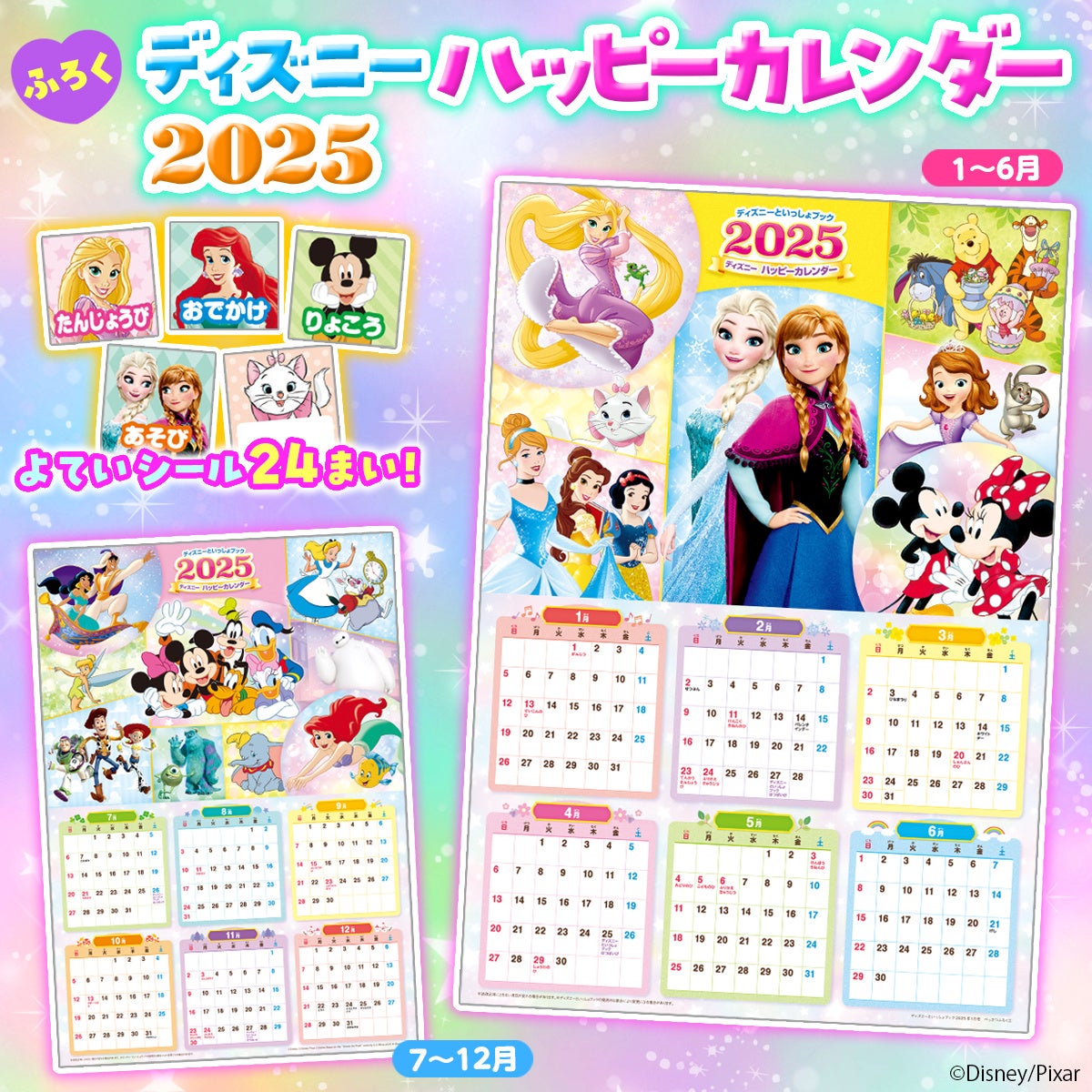 エルサとアナ、ミッキー&ミニー、ラプンツェル、アリエル、プーさんなど、人気のディズニーキャラクターがせいぞろいの特大ポスター型カレンダー! たんじょうびやおでかけなど、予定に合わせてはれるシールも24枚ついています。