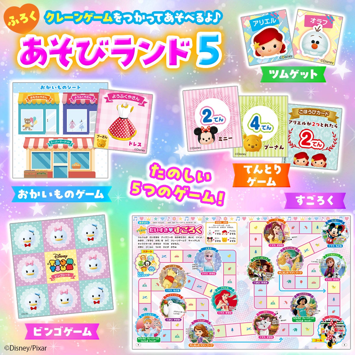 付録のクレーンゲームで、もっといろんなあそびを楽しめる!「あそびランド5」は、クレーンゲームを使う5つのあそびのセットです。「すごろく」「ビンゴゲーム」「おかいものゲーム」「てんとりゲーム」「ツムゲット」、すきなあそびをえらんで、家族やお友だちともりあがりましょう!
