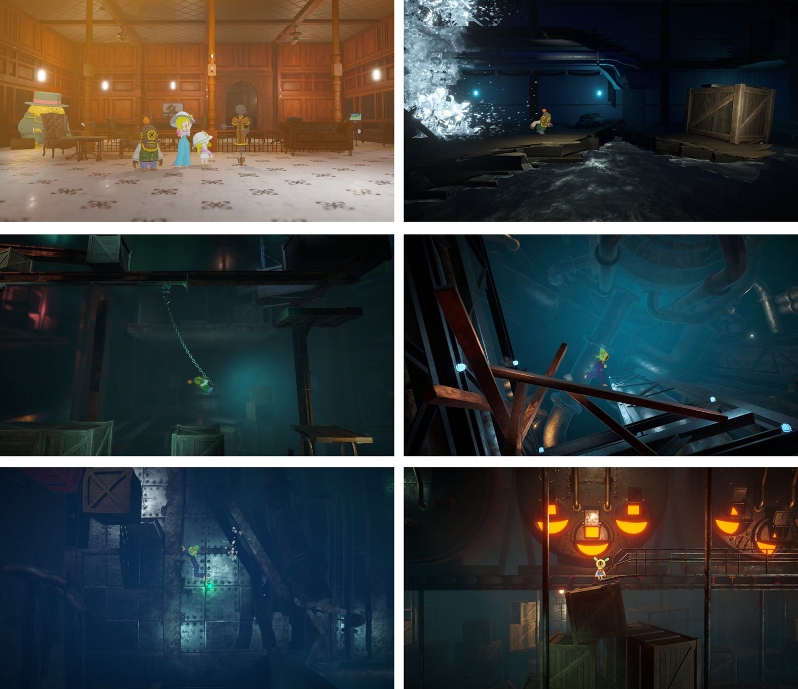 物語の進行や時間の経過に伴い、水位が上昇したり、ステージが傾いたりと環境が動的に変化します。