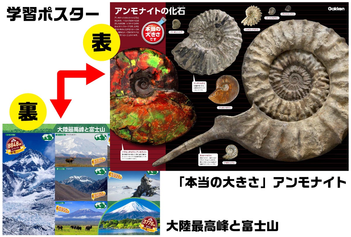 付属するDVD以外にも豪華特典が付きます。B3サイズの学習ポスターは両面使える仕様。表面は、大小さまざまなアンモナイトの化石を「本当の大きさ」で掲載。特に直径30cmを超える種の写真は圧巻です。裏面には、世界6大陸それぞれの最高峰の山々と日本一高い富士山の美しい写真を掲載しています。