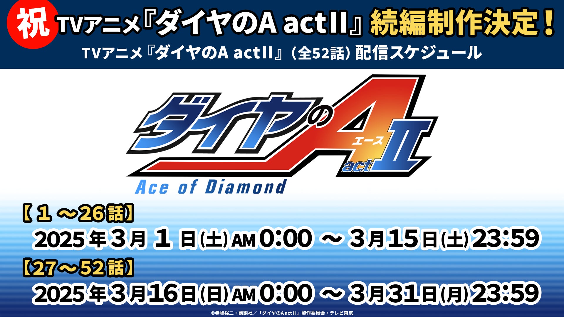 寺嶋裕二による漫画『ダイヤのA actⅡ』を原作とする、TVアニメ『ダイヤのA actⅡ』の続編制作が大決定!そして昨年末より、著者最新作『ダイヤのA actⅡ 外伝 帝東VS.鵜久森』が『週刊少年マガジン』にて短期集中で連載開始となり、大変話題となりました!これを記念しまして、講談社が運営するYouTubeチャンネル「フル☆アニメTV」にて、TVアニメ『ダイヤのA actⅡ』全52話を順次無料配信いたします。【1~26話】が本日3月1日から3月15日まで、【27~52話】を3月16日から3月31日までの期間限定配信となりますので、ぜひお楽しみください!