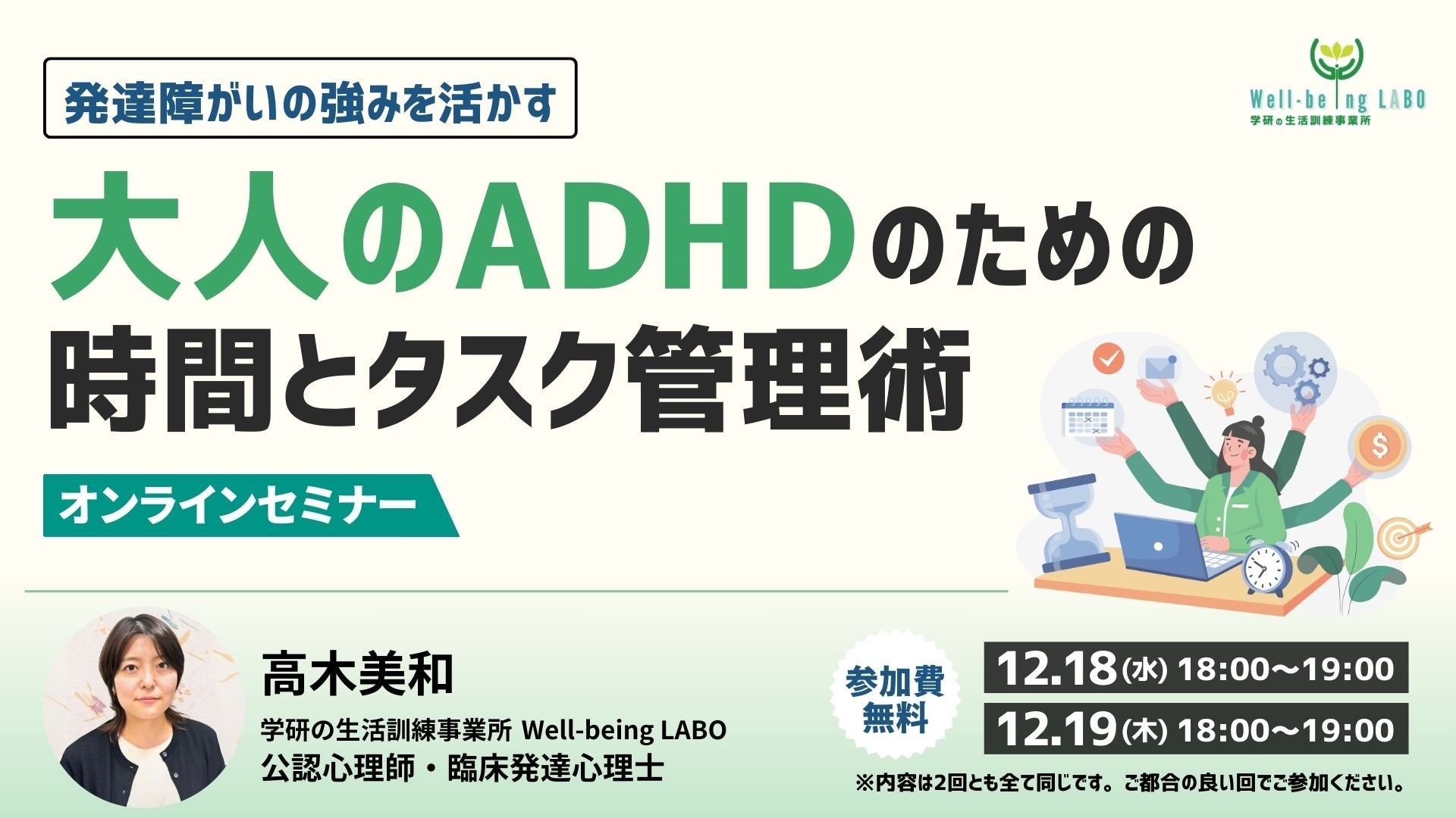 学研のWell-being LABOが「発達障がいの強みを活かす~大人のADHDのための時間とタスク管理術」無料オンラインセミナーを12月18日(水)、12月19日(木)に開催いたします!