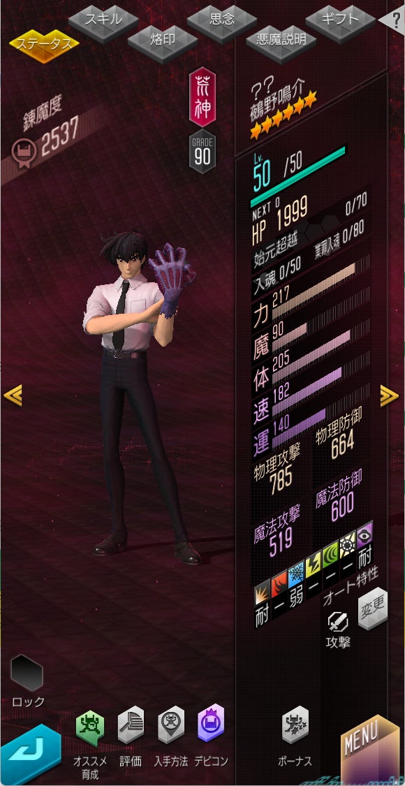 敵単体に5回、破魔または呪殺属性の打撃型ダメージを威力70(合計350)で与える。(属性は自動選択)