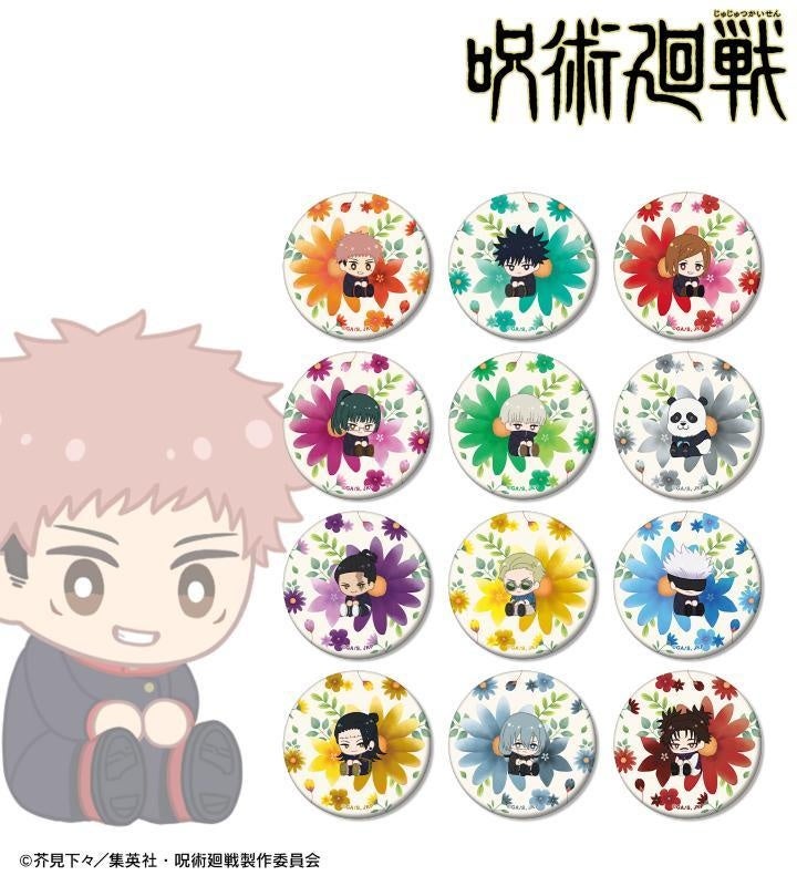 虎杖悠仁、伏黒 恵、釘崎野薔薇、禪院真希、狗巻 棘、パンダ、東堂 葵、七海建人、五条 悟、夏油 傑、真人、脹相のイラストをボタニカルデザインに落とし込んで繊細なタッチで新たに描き起こし、マットな手触りの缶バッジに仕上げました。