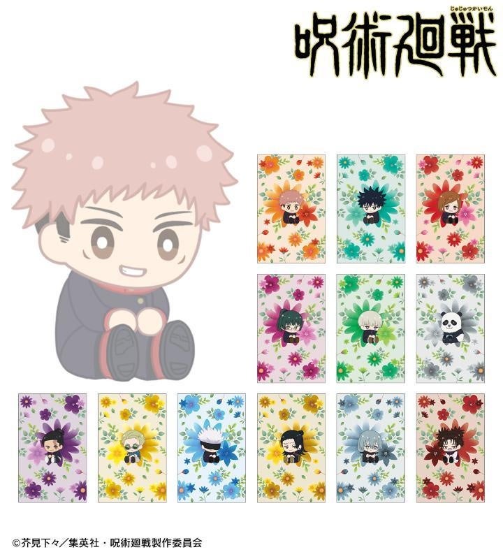 虎杖悠仁、伏黒 恵、釘崎野薔薇、禪院真希、狗巻 棘、パンダ、東堂 葵、七海建人、五条 悟、夏油 傑、真人、脹相のイラストをボタニカルデザインに落とし込んで繊細なタッチで新たに描き起こし、トレカホルダーに仕上げました。