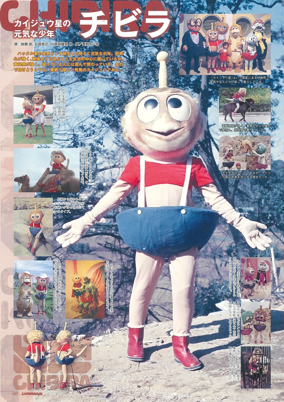 もう一作、掲載されている『チビラくん』(1970年)は1エピソード15分、月曜から土曜の週6エピソードで1話が完結し、それが1年半にわたり全468エピソード・78話放送されたという異色作です。主人公のカイジュウ・チビラくんとその家族をはじめ、ほとんどの登場キャラクターがスーツアクターによって演じられ、愉快なドタバタ劇が繰り広げられます。掲載5作品のうち『チビラくん』だけはキャラクターの紹介が主な記事となっています。