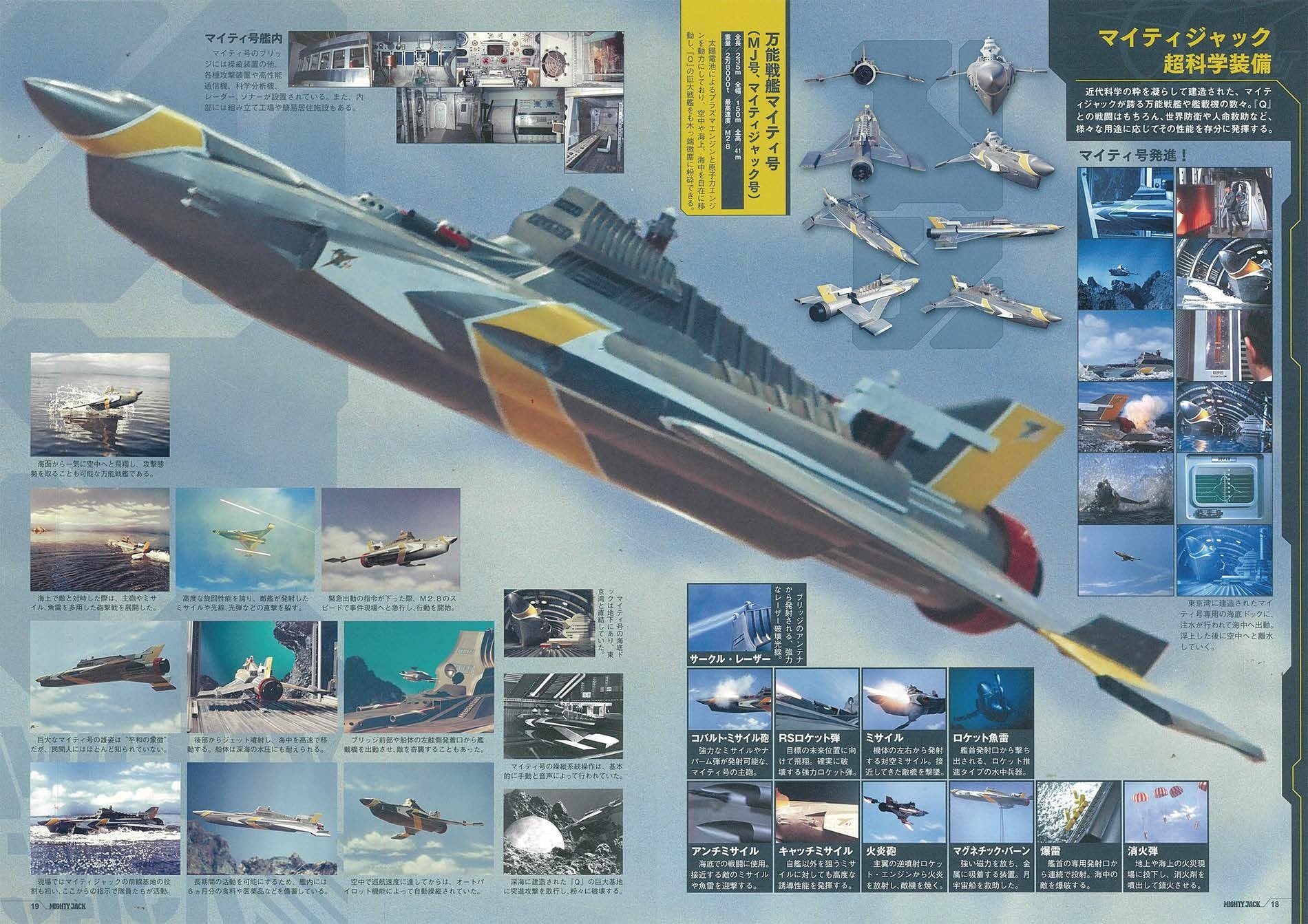 まず、『マイティジャック』(1968年)は万能戦艦マイティジャック号をはじめとするスーパーメカ特撮と、生身のスパイアクションを合体させた、大人も楽しめる1時間ドラマシリーズです。最新科学や恐ろしい兵器を悪用して陰謀を企む謎の組織『Q』と数々のスーパーメカや秘密アイテムで正義のために戦うマイティジャックとの頭脳戦、肉弾戦、メカ戦を痛快に描きます。本書では登場キャラクターをはじめ、敵・味方のメカ、各話のストーリーも詳しく紹介しています。
