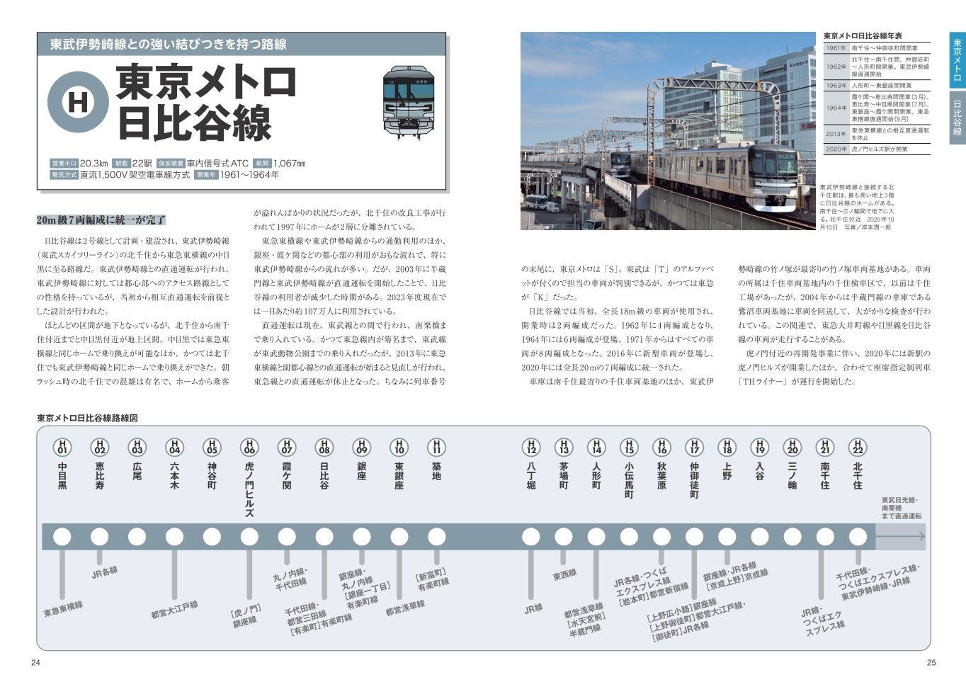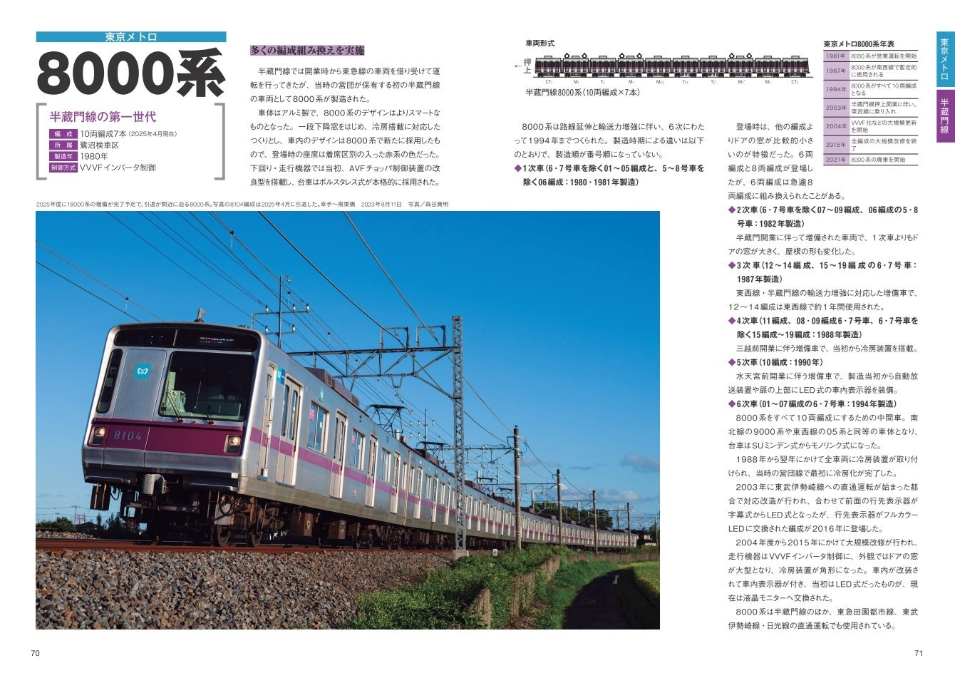 本書はビジュアルガイドと位置付け、各路線の専用車両と、直通運転で乗り入れてくる車両を大きなカラー写真で掲載しています。写真は2023年版からすべて変更しています(一部コラムを除く)。各路線の車両には詳しい解説を掲載し、見て楽しく、読んで理解を深められる内容です。また、巻末には2025年度の引退が予定している東京メトロ8000系と、そのルーツにあたる6000系、7000系を掲載。「地下鉄らしい電車」として一時代を築いたグループを振り返ります。