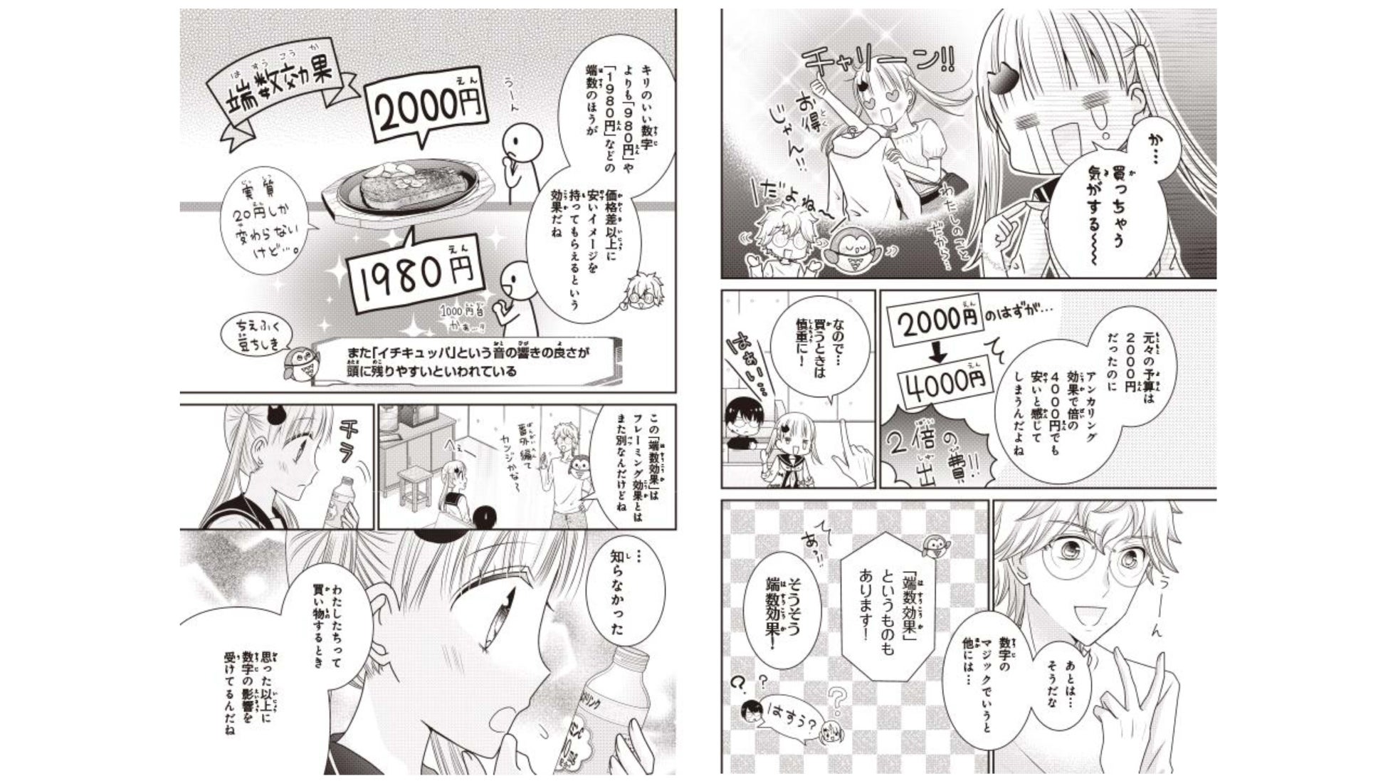 今回も「漫画+解説」の最強のタッグは健在! 大人はすぐにイメージできても、お子さんにはすぐにイメージがつきづらいシーンや仕組みなどは漫画で再現しています。例えば最初に見た数字がその後の判断に影響を与える「アンカリング効果」は楽しいショッピングで、キリの良い数字よりも端数の方が価格差以上に安いイメージになる「端数効果」はステーキを例に解説など、理解が十分に深まります。