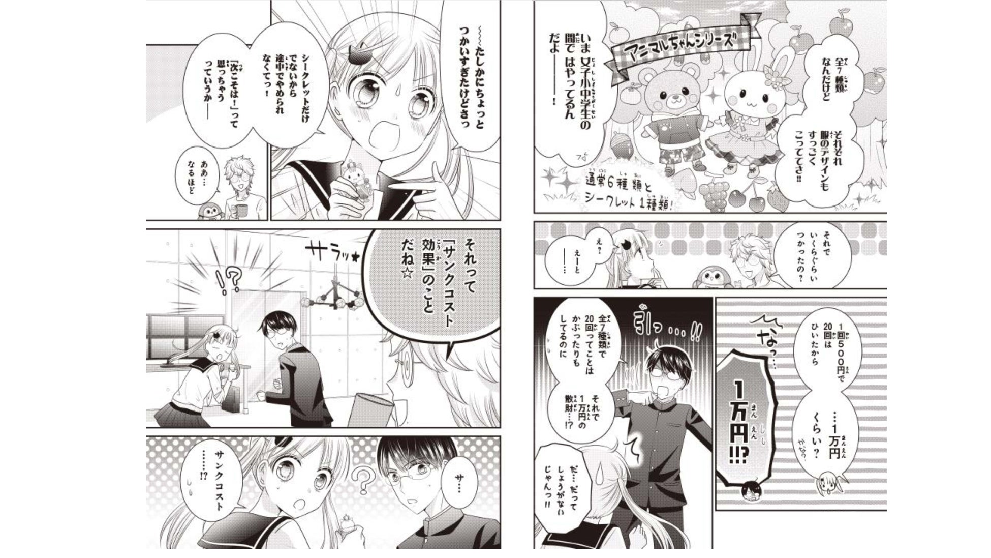 行動経済学とは、経済学と心理学を合わせたもので、人の感情や判断行動のメカニズムから経済の行動を読み解くことで、私たちのごく身近に存在しています。たとえば第一話では、大流行のカプセルトイに主人公・真白が我を忘れて熱中。なぜここまで夢中になるのか熱心に説明する真白に、指南役の朝倉が「それってサンクコスト効果だね」と発言し、そこから話が広がります。 カプセルトイで目当てのものが出てくるまで熱中する経験、皆さんにもありませんか?