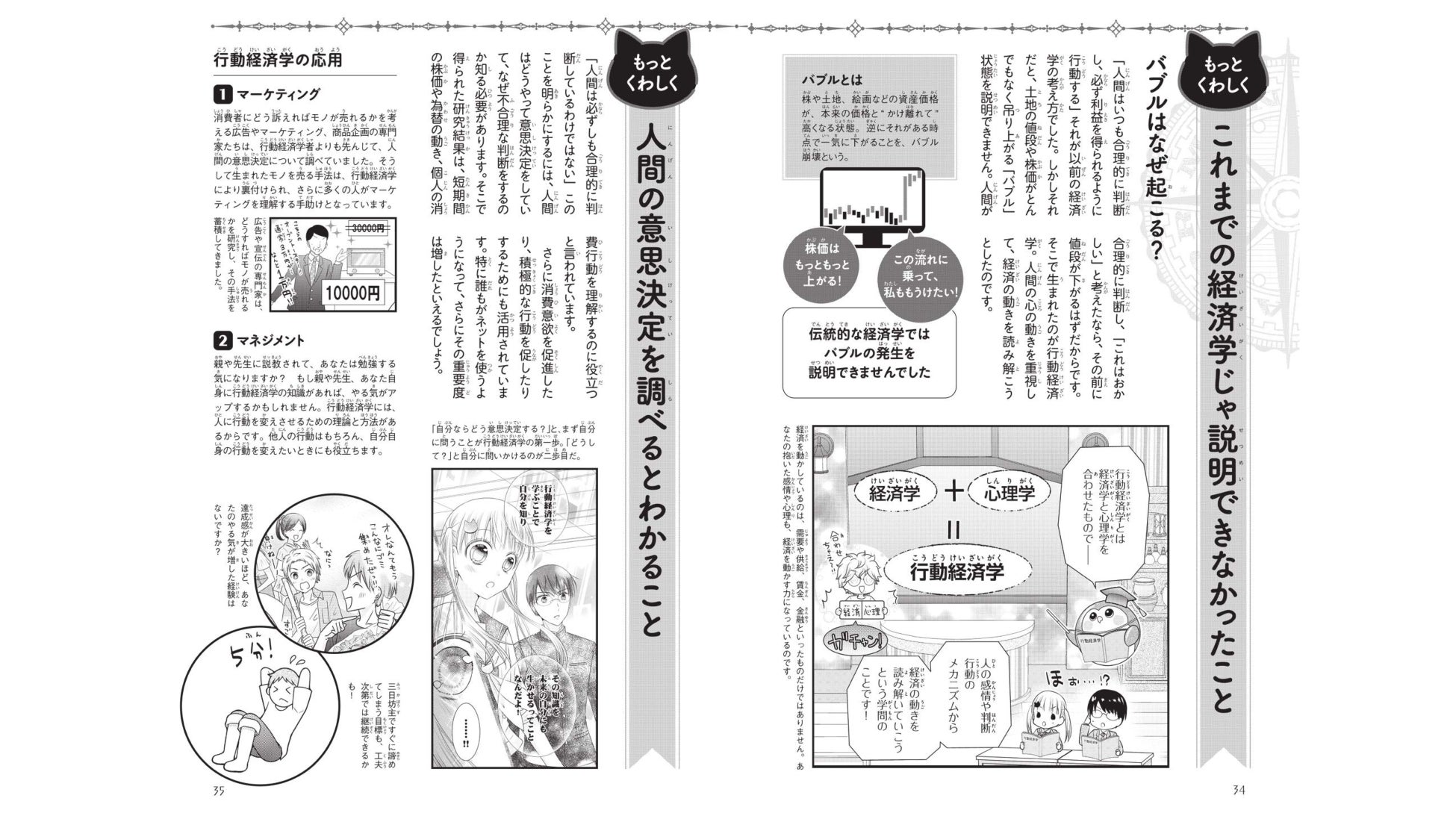 前巻では「物の値段と物の価値」、「円高と円安」さらに「現金VSキャッシュレス」など、主にお金に関する基礎知識やマネーリテラシーについて学べる内容で、まさに「お金の入門書」にピッタリでした。2巻は1巻の続刊、というスタンスではなく、「行動経済学」という一見難しく、とっつきにくいテーマに新しく切り込んだ内容となっています。