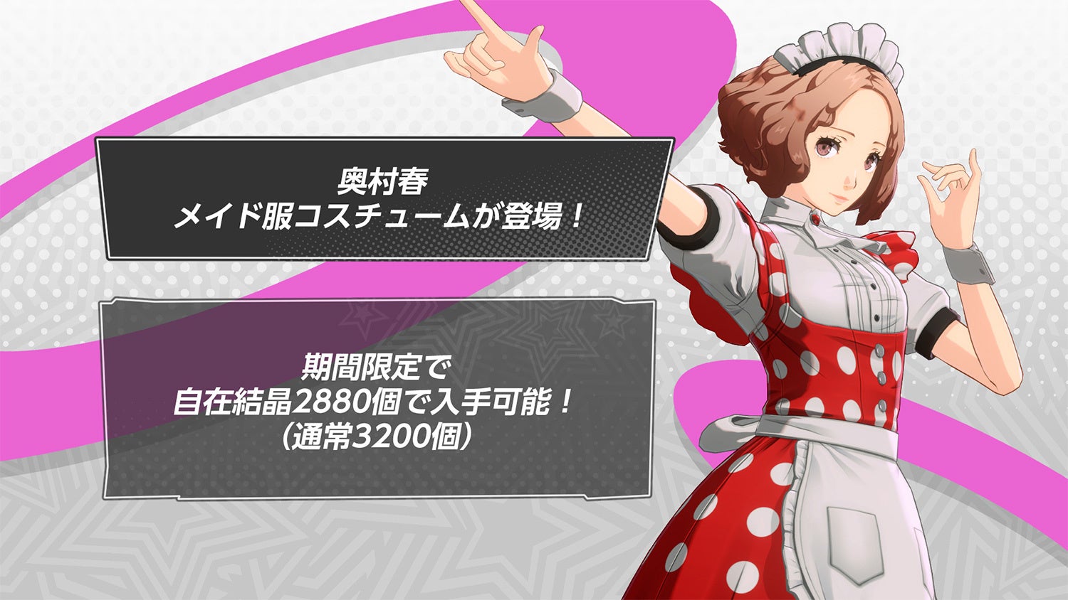 特別な装いでバトルを楽しめる“スペシャルコスチューム”に、「メイド服・奥村 春」が登場しました。コスチュームは「ショップ」で購入が可能です。また、新コスチュームの登場記念として、2026年1月8日(木)10:59まで、購入に必要な「自在結晶」が3,200→2,880個になるオトクなセールを実施中です。