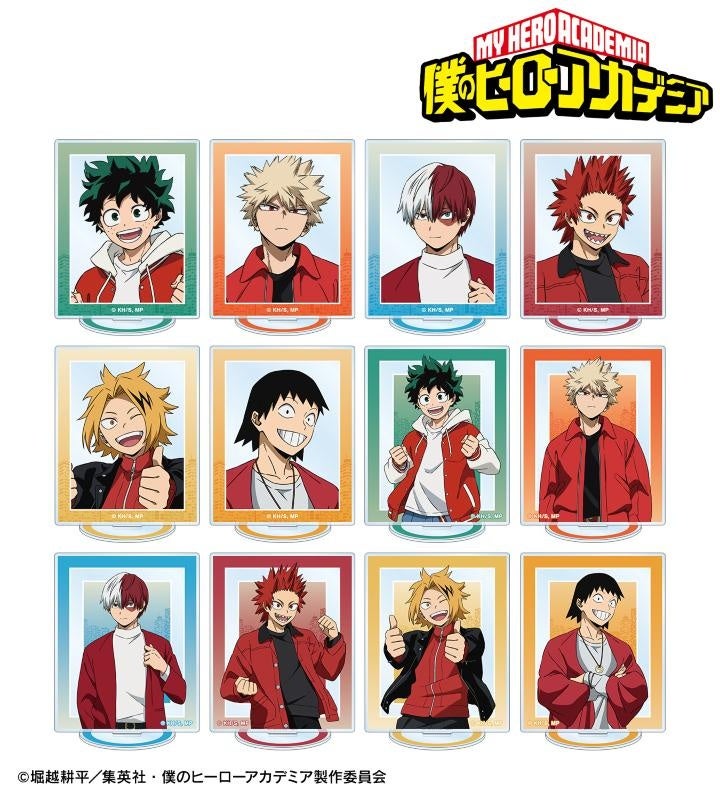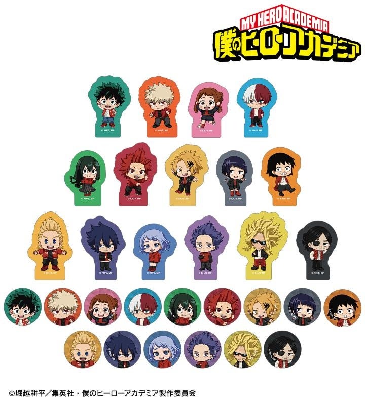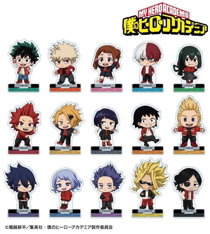 緑谷出久、爆豪勝己、麗日お茶子、轟焦凍、蛙吹梅雨、切島鋭児郎、上鳴電気、耳郎響香、瀬呂範太、通形ミリオ、天喰環、波動ねじれ、心操人使、オールマイト、相澤消太のちびキャラビジュアルをアクリルスタンドに仕上げました。