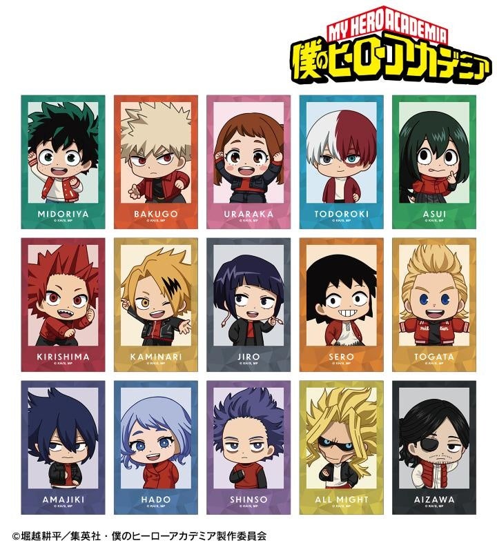 緑谷出久、爆豪勝己、麗日お茶子、轟焦凍、蛙吹梅雨、切島鋭児郎、上鳴電気、耳郎響香、瀬呂範太、通形ミリオ、天喰環、波動ねじれ、心操人使、オールマイト、相澤消太のちびキャラビジュアルをイラストカードに仕上げました。