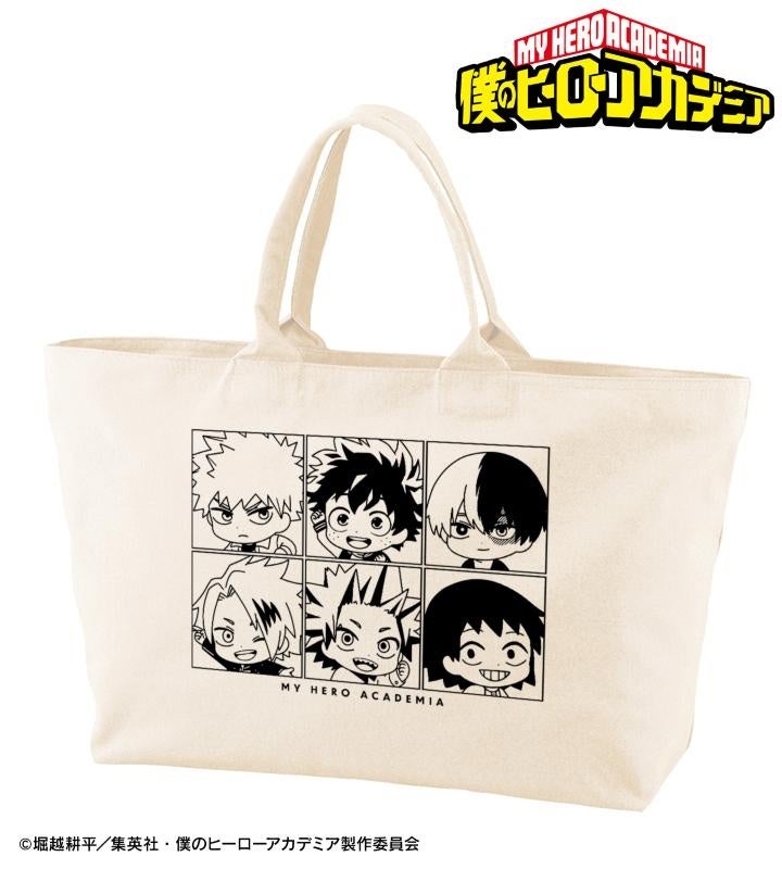 緑谷出久、爆豪勝己、轟焦凍、切島鋭児郎、上鳴電気、瀬呂範太のちびキャラビジュアルをBIGなジップトートバッグに仕上げました。