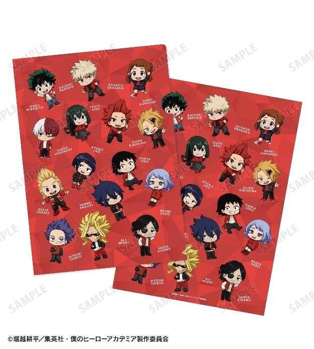 緑谷出久、爆豪勝己、麗日お茶子、轟焦凍、蛙吹梅雨、切島鋭児郎、上鳴電気、耳郎響香、瀬呂範太、通形ミリオ、天喰環、波動ねじれ、心操人使、オールマイト、相澤消太のちびキャラビジュアルをクリアファイルに仕上げました。