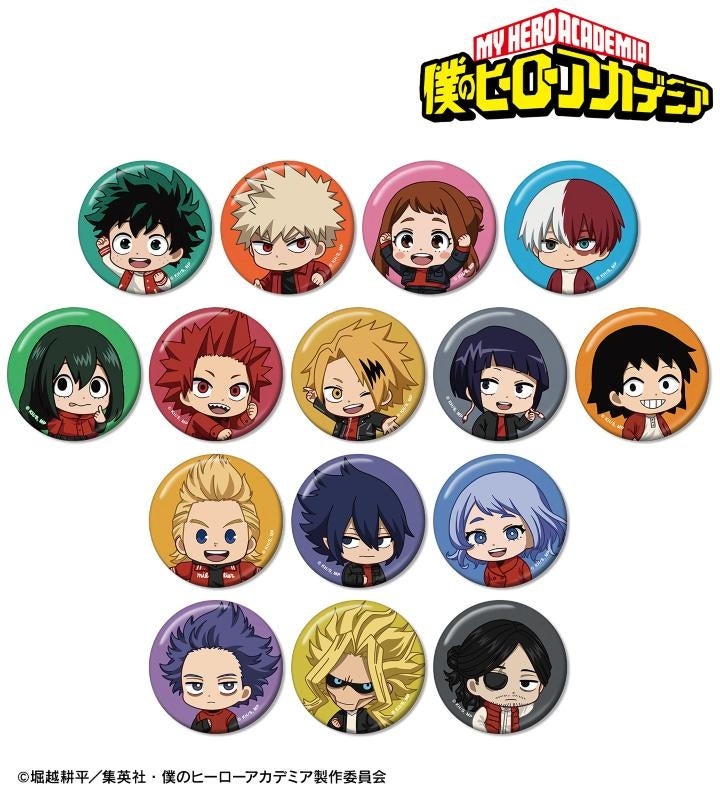 緑谷出久、爆豪勝己、麗日お茶子、轟焦凍、蛙吹梅雨、切島鋭児郎、上鳴電気、耳郎響香、瀬呂範太、通形ミリオ、天喰環、波動ねじれ、心操人使、オールマイト、相澤消太のちびキャラビジュアルをメタリック仕様の缶バッジに仕上げました。