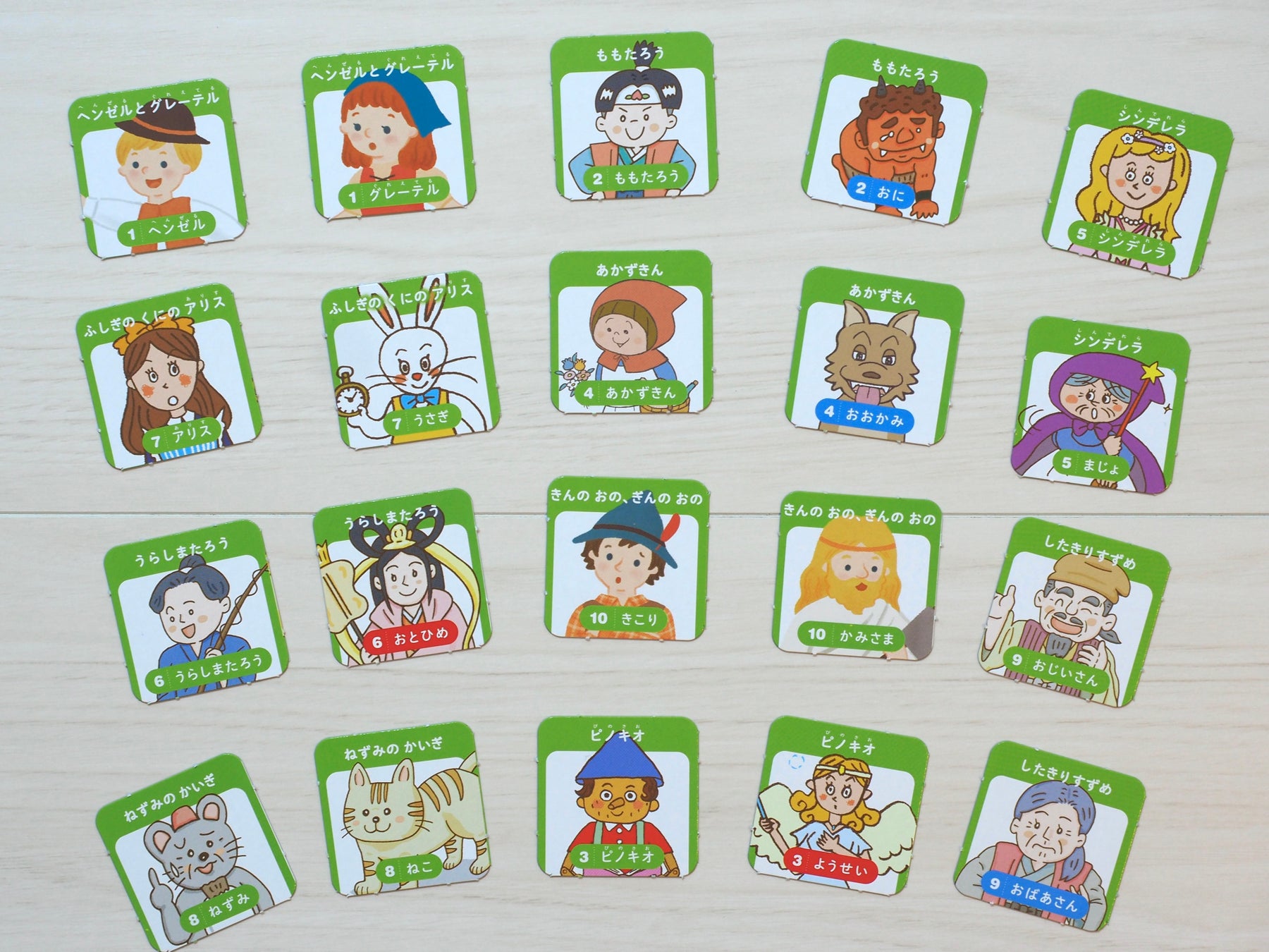 あらすじと登場人物を結びつけて、親子で楽しくかるたのように遊ぶこともできます。
