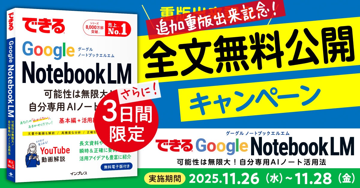インプレスグループでIT関連メディア事業を展開する株式会社インプレス(本社:東京都千代田区、代表取締役社長:高橋 隆志)は、書籍『できる Google NotebookLM 可能性は無限大!自分専用AIノート活用法』の重版3刷決定を記念して、2025年11月26日(水)から28日(金)までの3日間限定で、本書の全文無料公開キャンペーンを実施いたします。